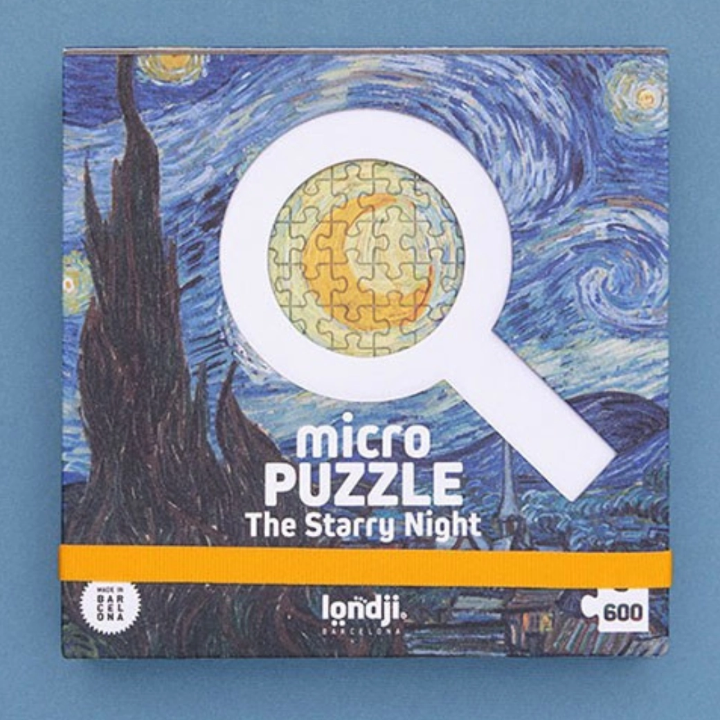 Uživajte v Zvezdni noči v drugi dimenziji. Micro puzzle znamke Londji prinaša slavno delo v obliki bistre izzivalne sestavljanke: majhni koščki, veliko veselje ob sestavljanju. Zahvaljujoč kakovostnemu papirju in natančnemu izseku boste uživali v gladkem spajanju in ostrih detajlih motiva.