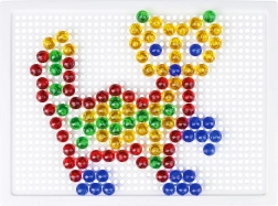V kompletu najdete trdno plastično mrežo velikosti 21 × 16 cm ter 140 klobučkov premera 10 mm – ravno prav za otroško ročico. Mozaika ne vsebuje predlog, zato naravno spodbuja prosto kreativnost in samostojno izmišljanje motivov.