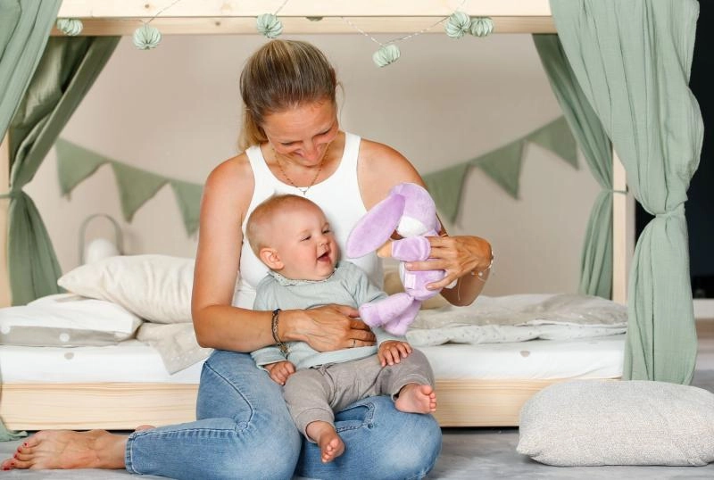 Minimalistični, a igrivi detajli – dolga ušeska, vezenine in nežne teksture – spodbujajo čutno zaznavanje, crkljanje in umirjanje. Zajček je popoln kot prva punčka za dojenčke od rojstva dalje ter prinaša blage spodbude za razvoj motorike in domišljije.