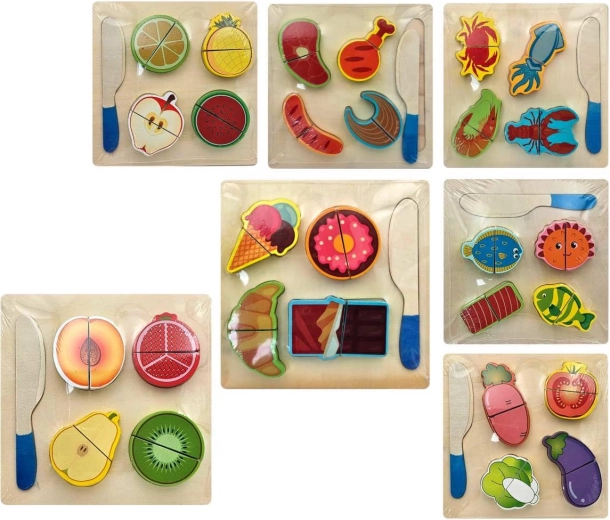 Komplet je na voljo v več motivih, na primer sadje, zelenjava ali pekovski izdelki. Vsak kos je izdelan iz trpežnega lesa z gladkimi robovi za varno igro. Cena velja za en kos/različico – idealno za postopno razširjanje otrokove zbirke živil.