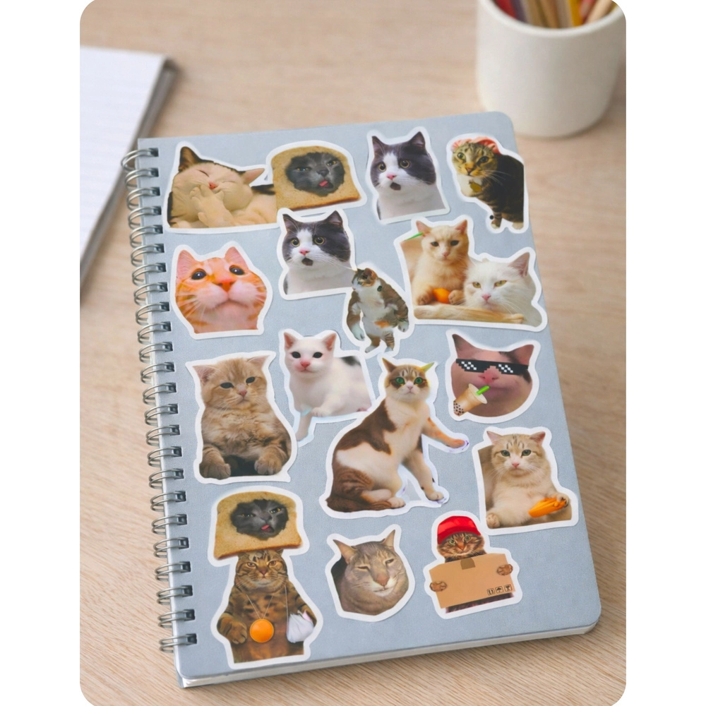 Imate radi mačke in humor? Ta univerzalen komplet dekorativnih nalepk z memovskimi mačkami spremeni vsak predmet v izvirnik. Z raznolikimi dizajni boste ustvarili edinstvene kompozicije na beležkah, dnevnikih, telefonih ali darilih. Bleščeča foto izvedba izstopa na svetlih in temnih površinah.