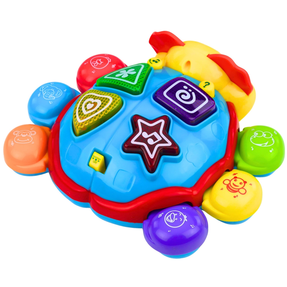 Utripajoče lučke so usklajene z zvoki. Otrok se na zabaven način spoznava z barvami in poimenovanji živali.