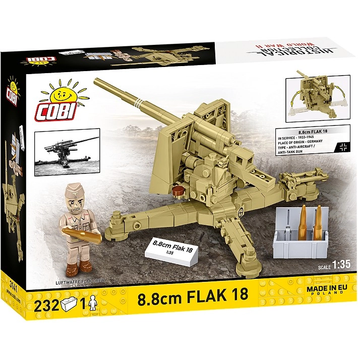 Uživajte v sestavljanju legendarne »osemosemdesetke«, ki je v drugi svetovni vojni slovela po natančnosti in moči. Ta model, navdihnjen z uporabo v severni Afriki, ponuja visoko stopnjo detajlov, od križne lafete in zaščitnega ščita do funkcijskih upravljalnih elementov. Zahvaljujoč obstojnim potiskom brez nalepk bo komplet dolgoročno ohranil vrhunski videz.