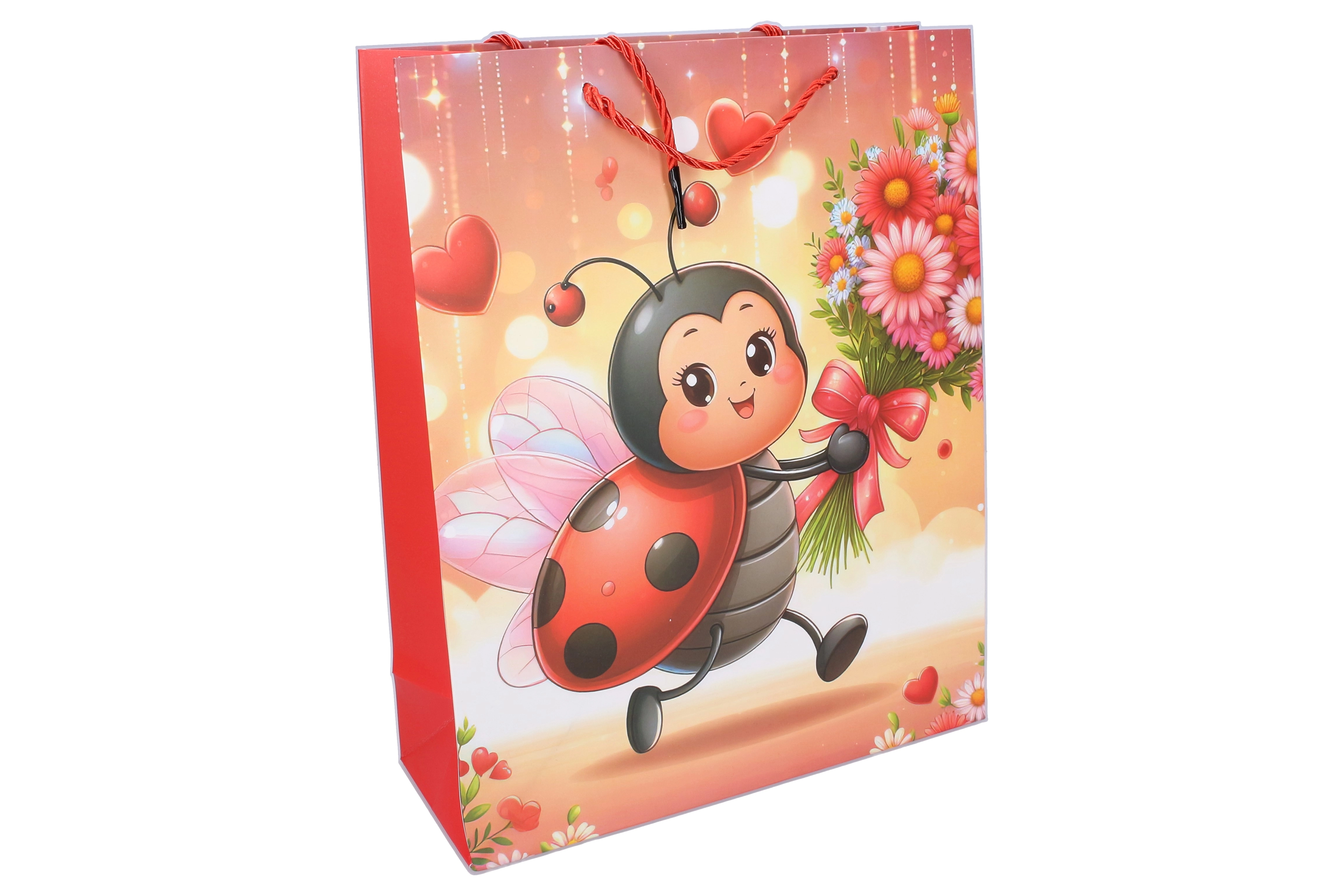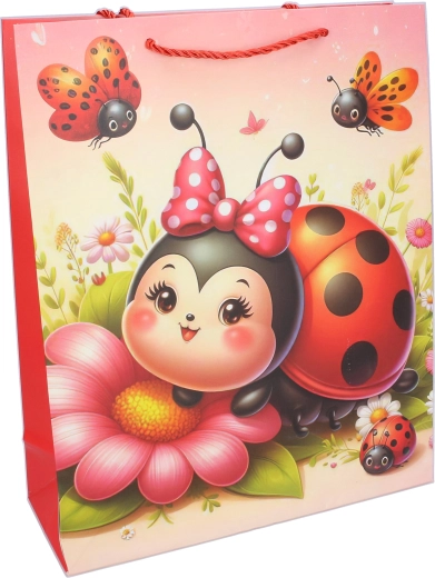 Ljubka darilna vrečka v kompaktni velikosti S (18 × 24 × 8,5 cm) z otroškim motivom pikapolonice razveseli male in velike. Idealna za manjša darila, igrače ali drobnarije. Ponuja 4 privlačne različice, je čvrsta, praktična in zahvaljujoč barvnemu tisku navduši že ob izročitvi.