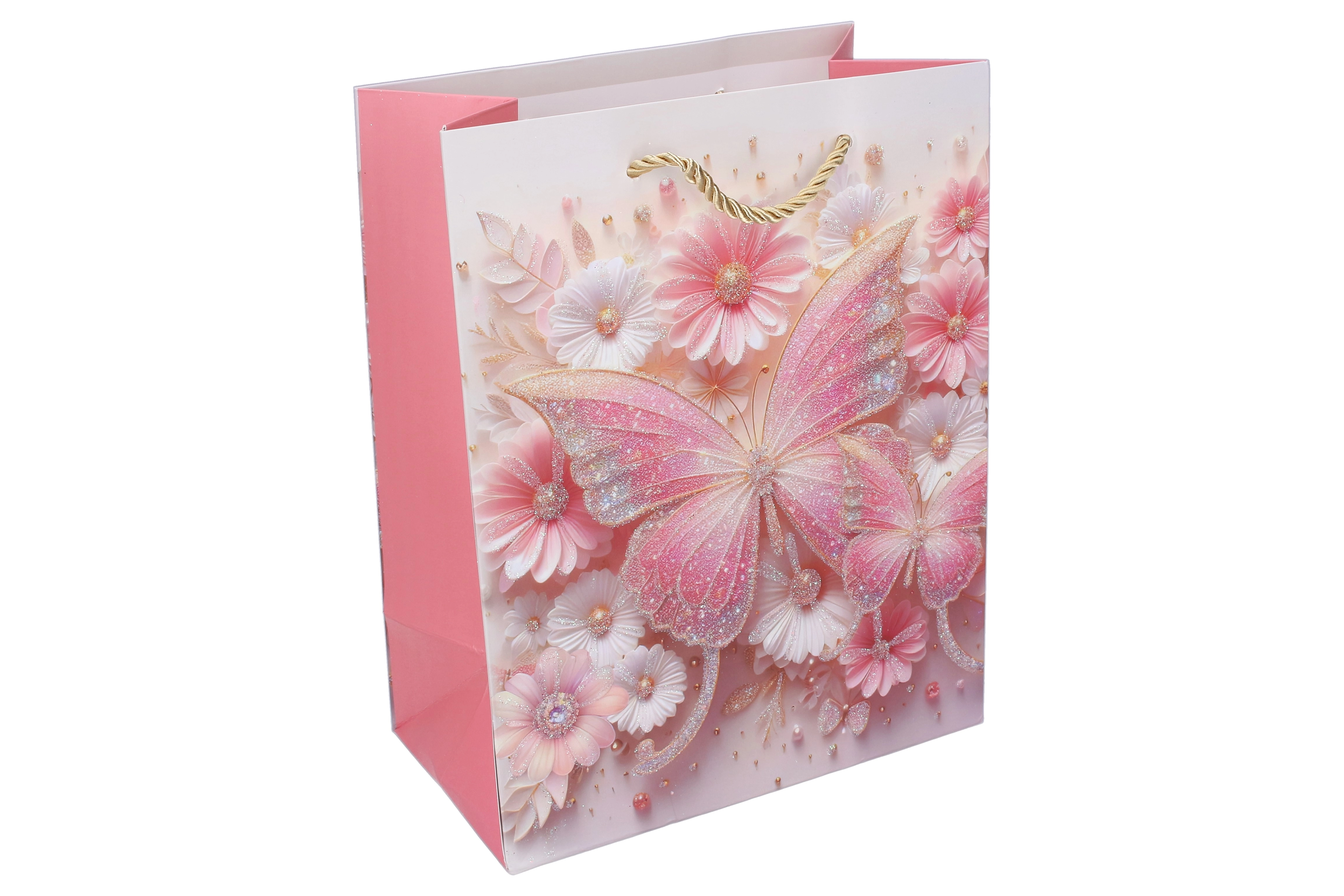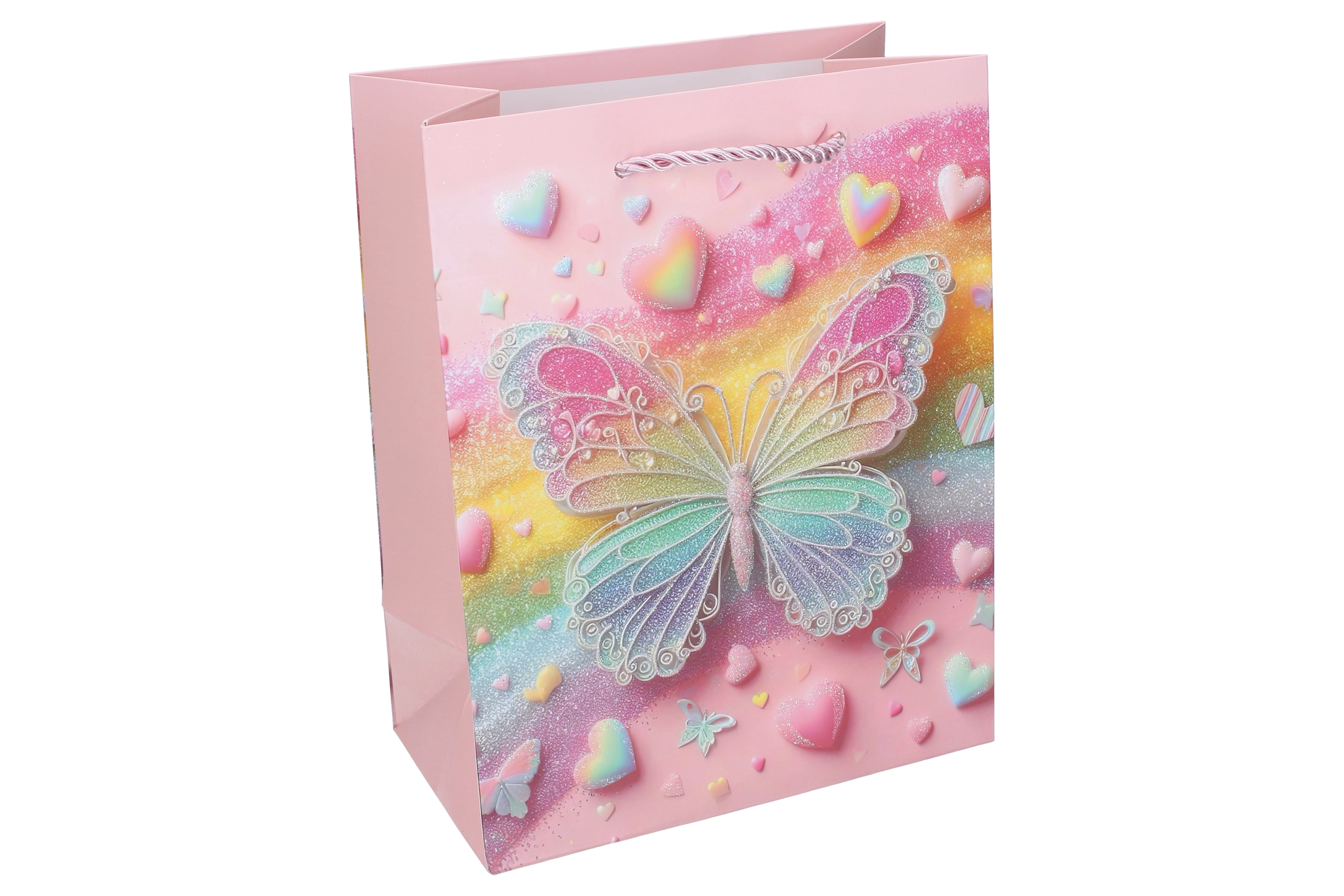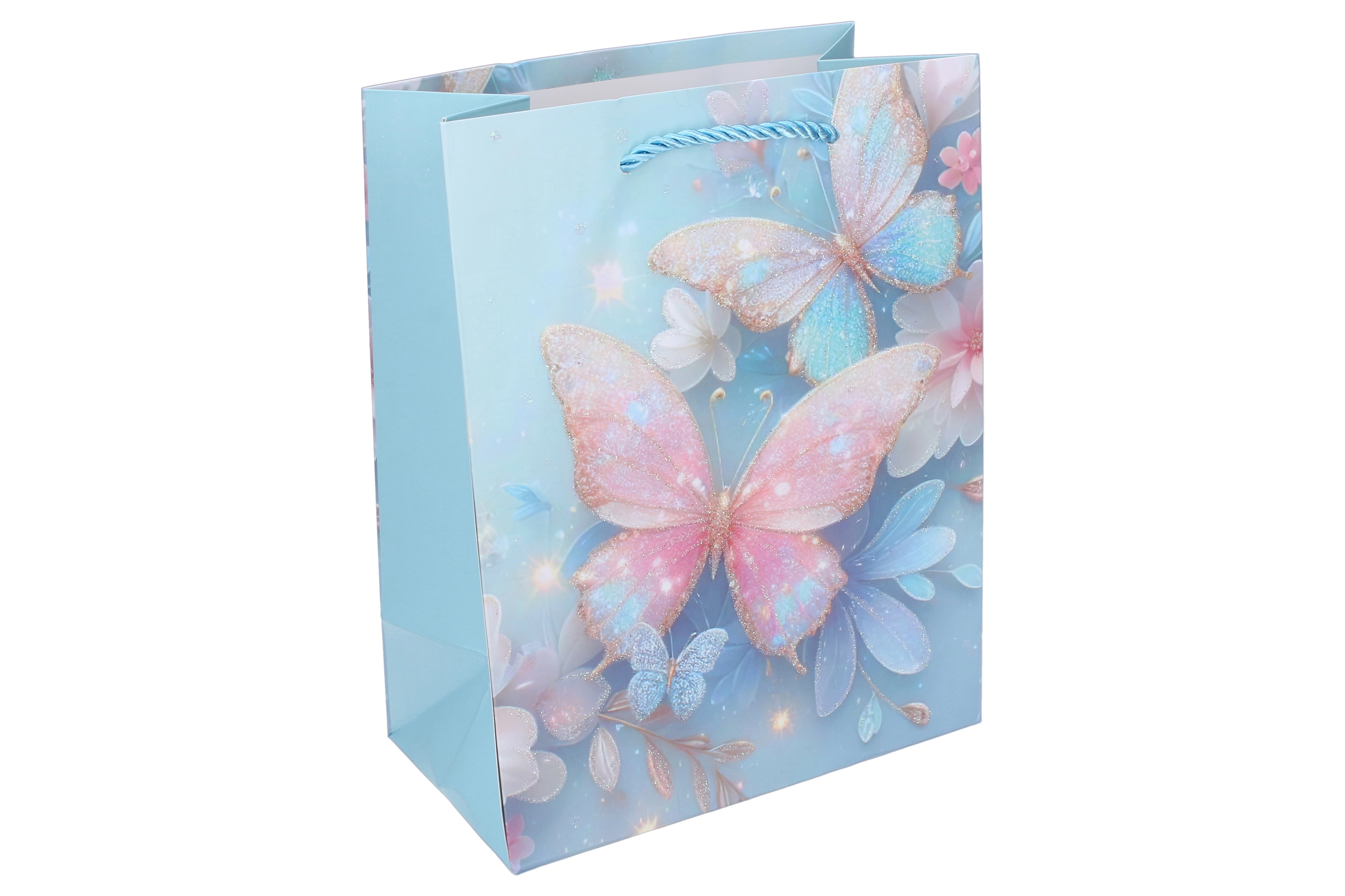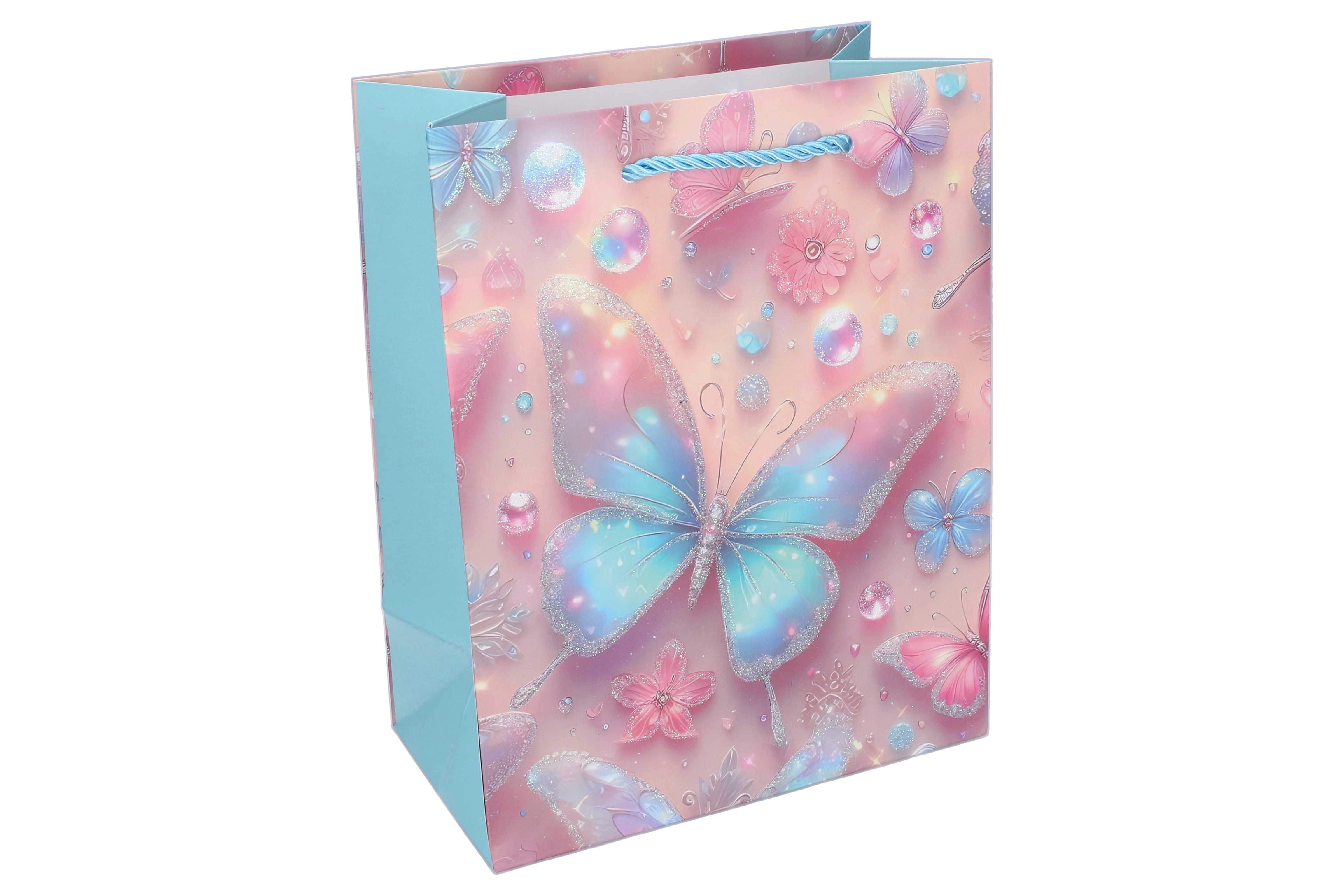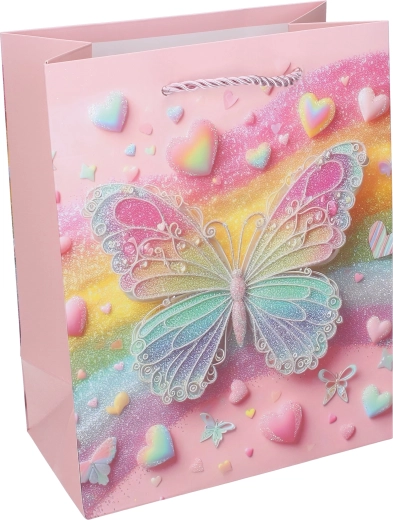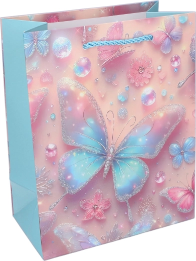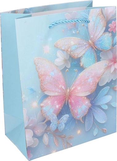 Zaradi trdne papirnate konstrukcije, ojačanega dna in zavitih vrvičastih ročajev je vrečka udobna in zanesljiva za prenašanje. Lesketajoči in bleščeči poudarki na metuljih podarijo darilu izjemen videz, ki razveseli male slavljence in njihove starše.