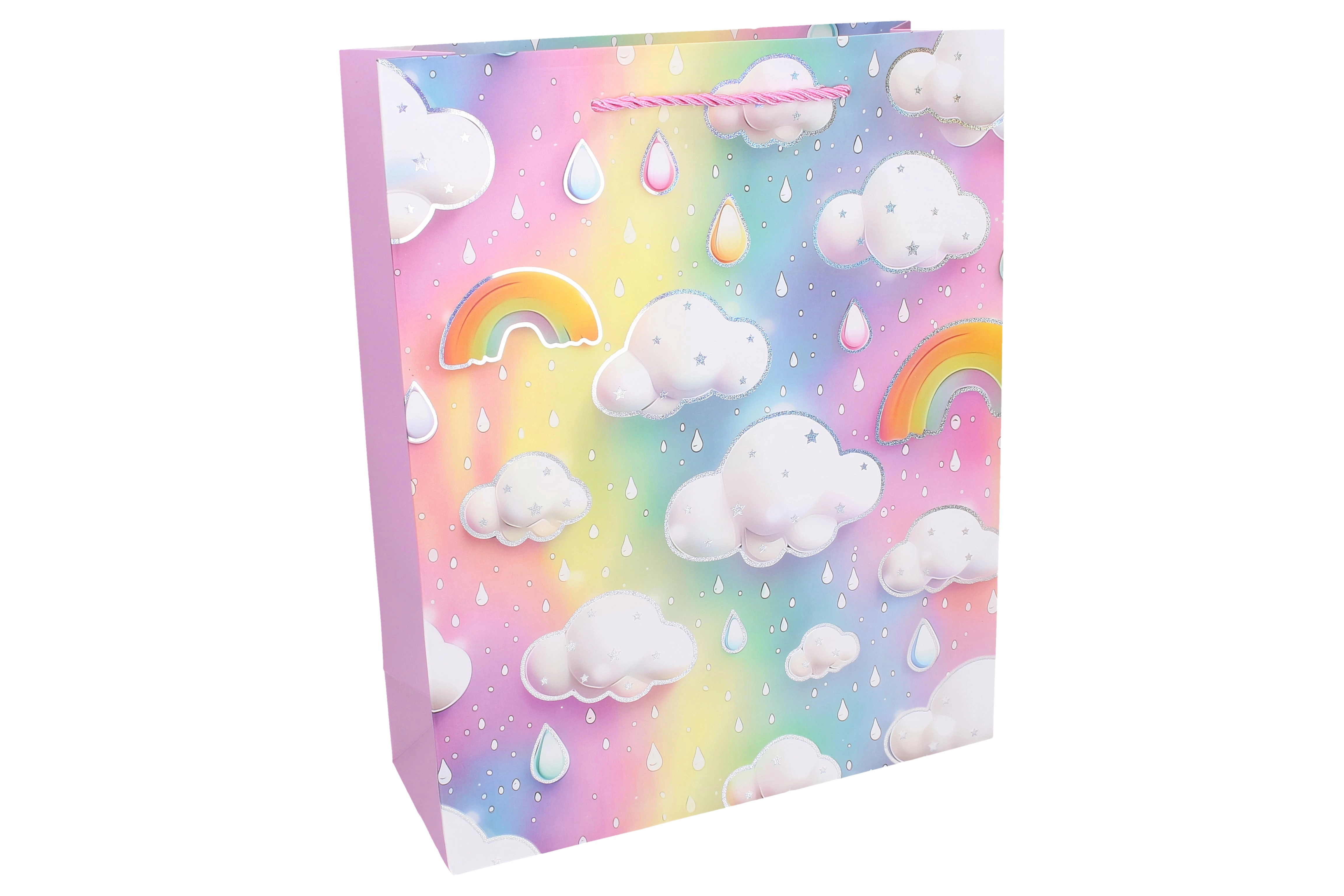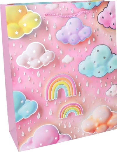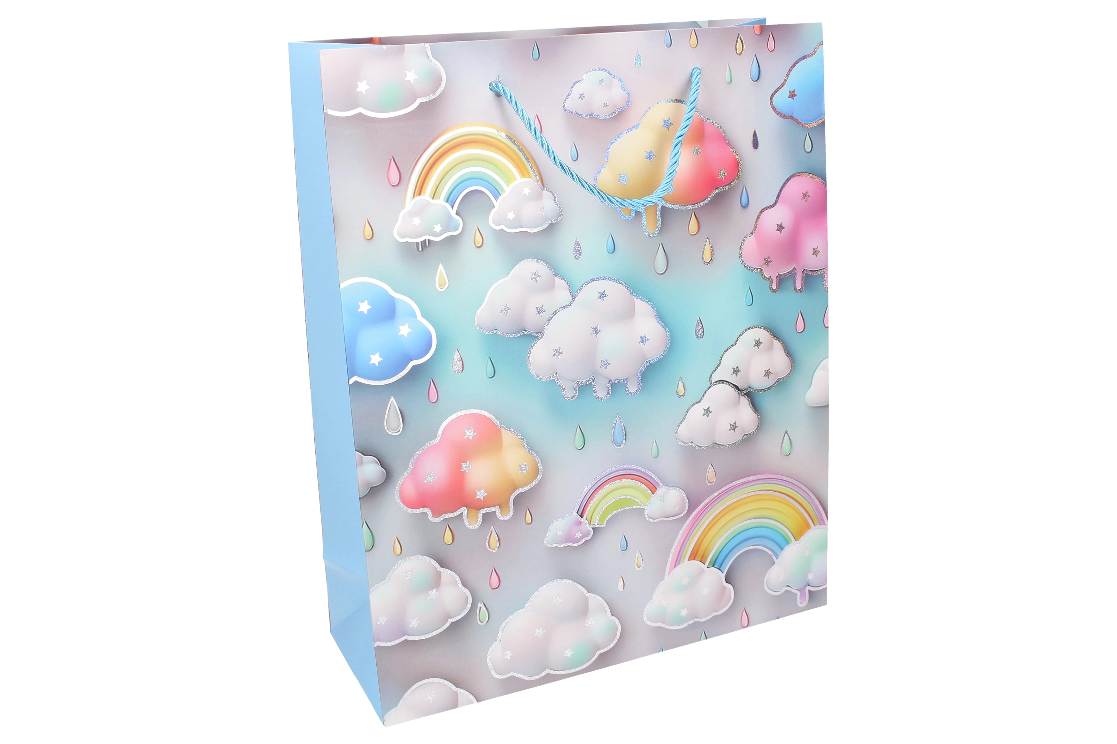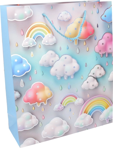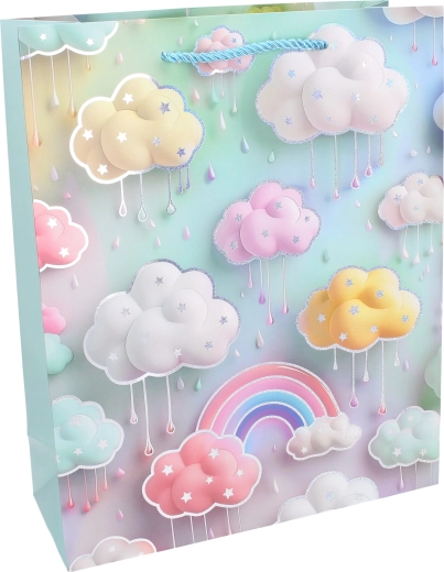 Pastelna mavrica, oblački in kapljice ustvarjajo nežen in igriv videz, ki razveseli vsakega otroka in poudari vaše darilo.
