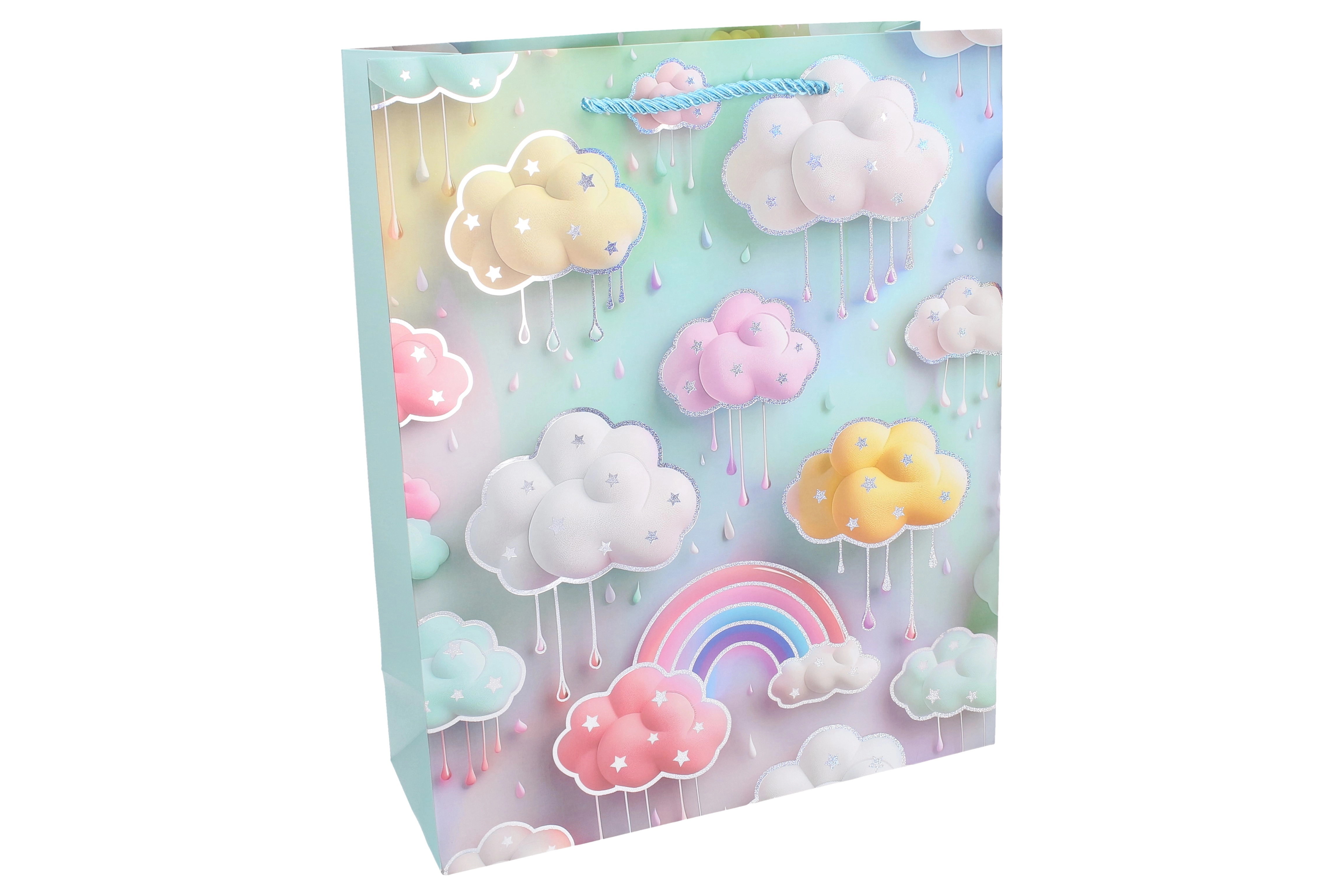 Nežni barvni prehodi, oblački, kapljice in mavrice ustvarijo veselo vzdušje in vsakemu darilu dodajo čaroben pridih.
