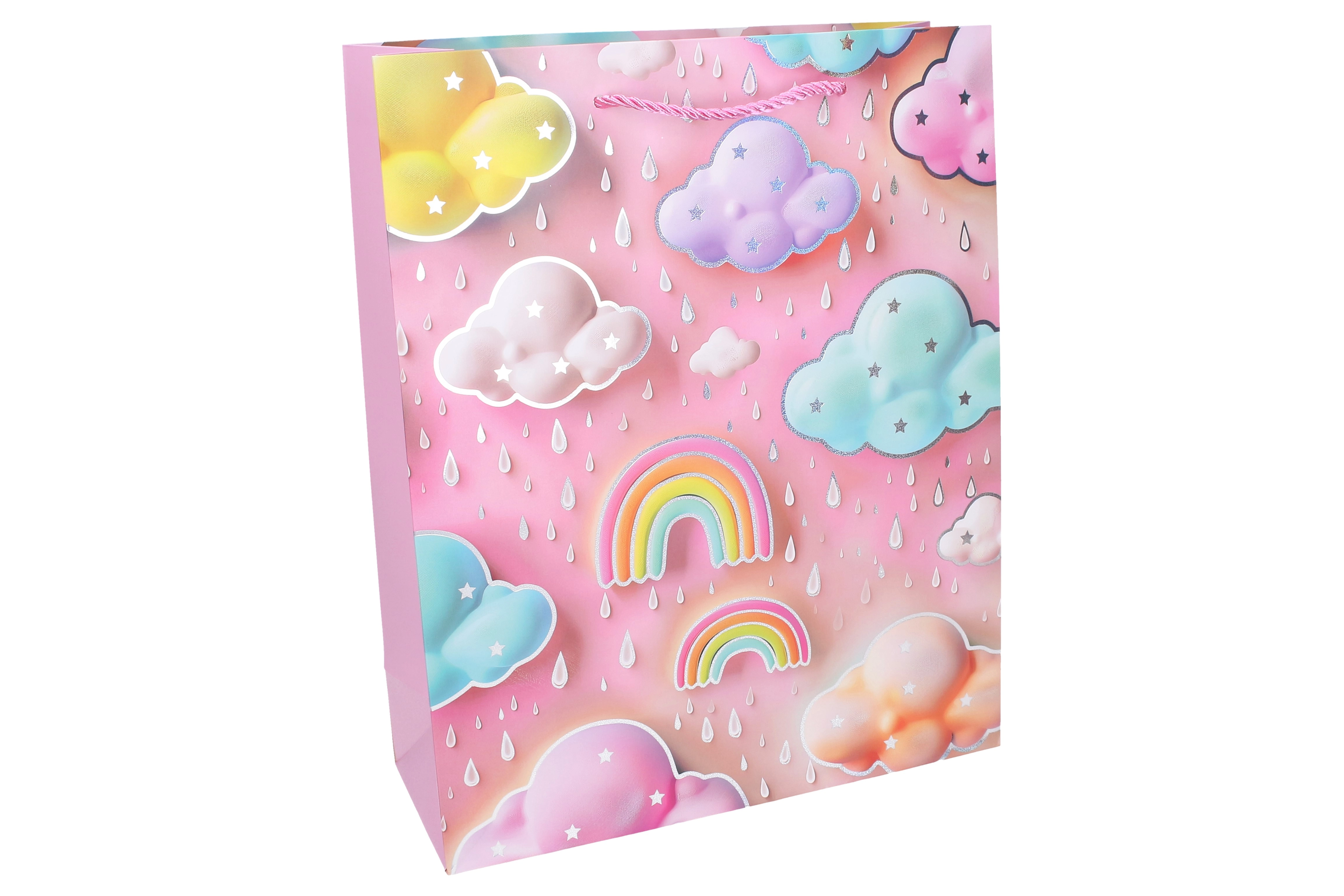 Ta stilska otroška darilna vrečka bo vašemu presenečenju dodala čaroben videz. Pastelni barvni prehod, igrive mavrice, oblački in zvezdice jo naredijo idealno izbiro za otroške zabave, rojstne dneve in krste. Zaradi formata S je odlična za knjige, plišaste igrače, kozmetiko ali manjše igračke.