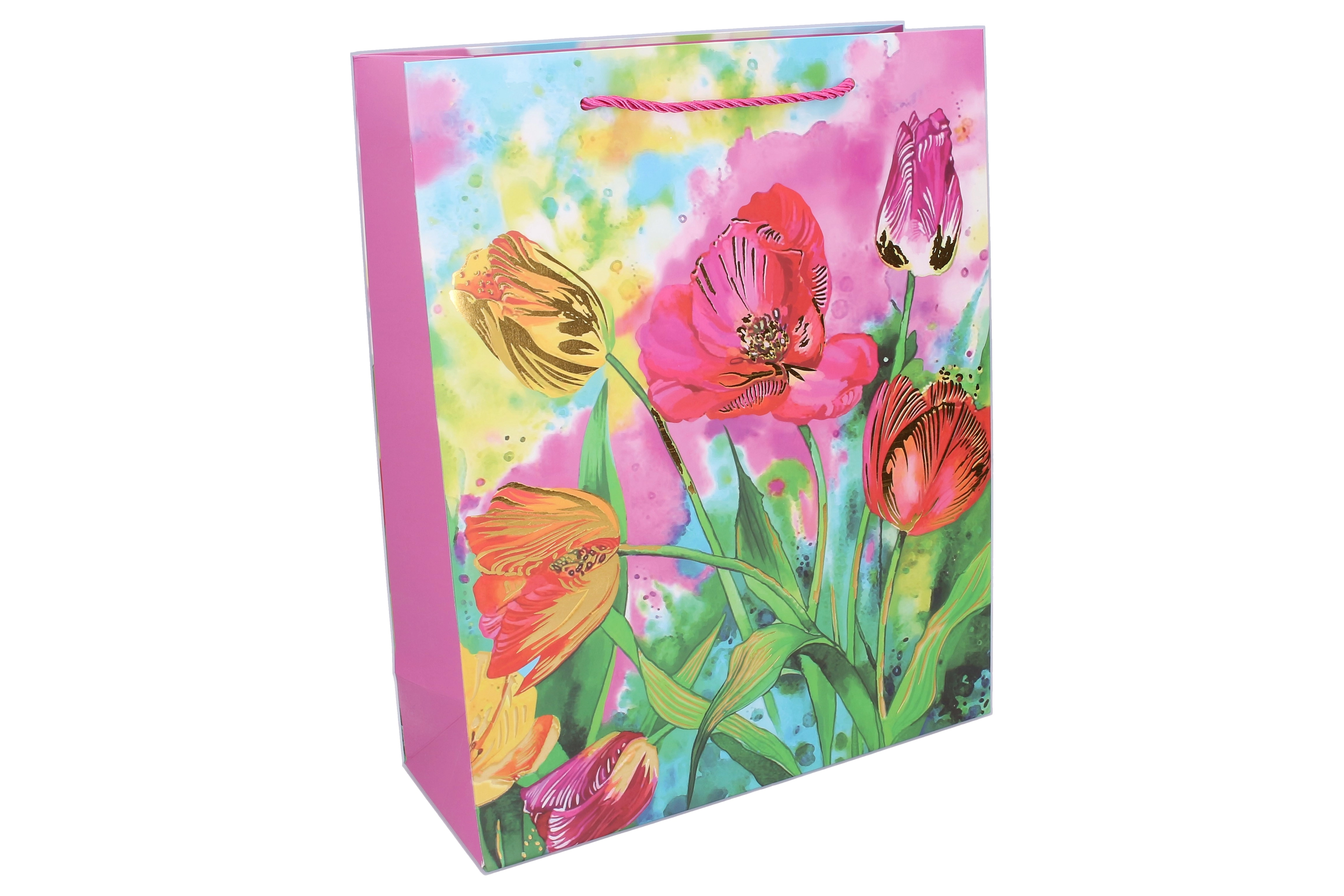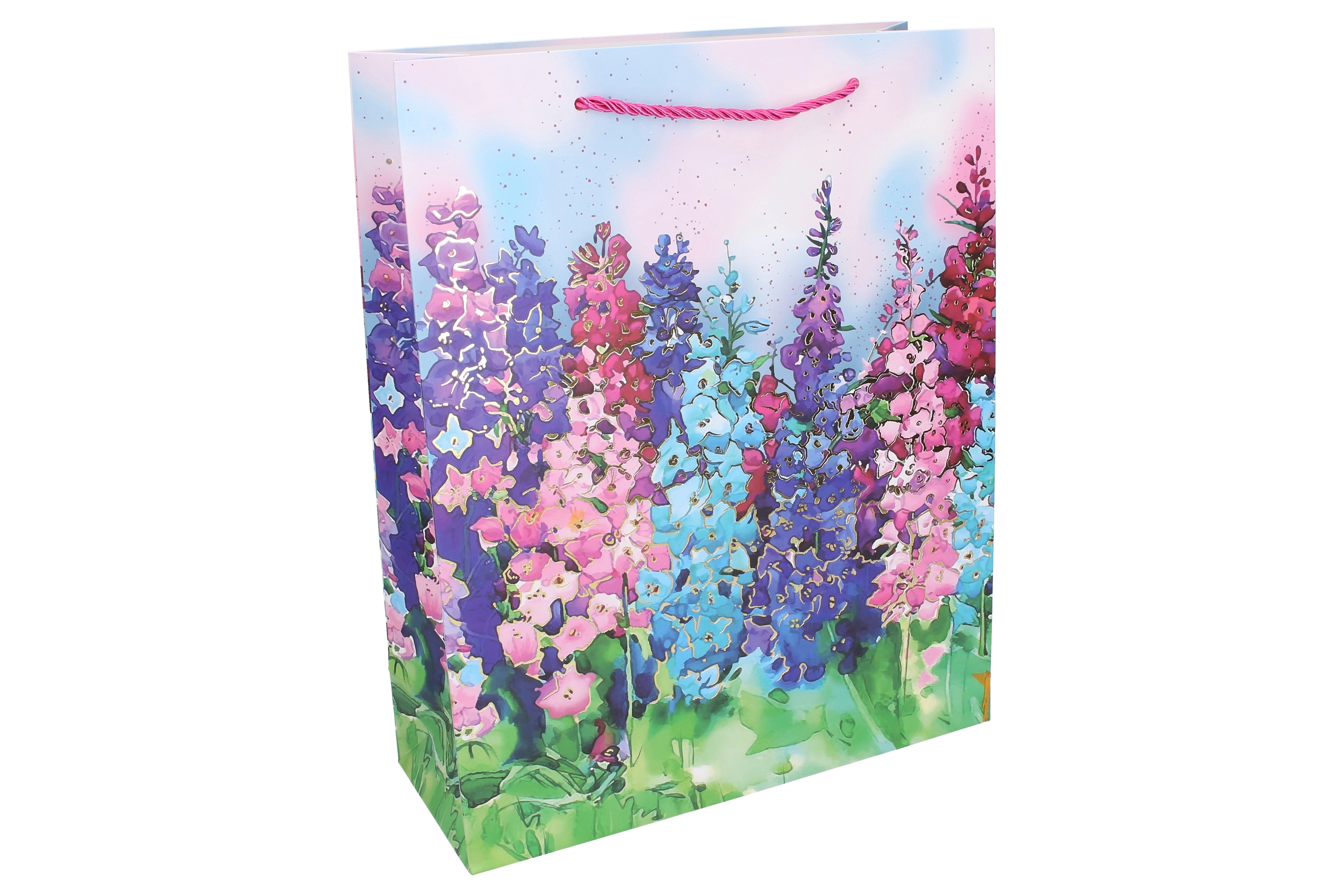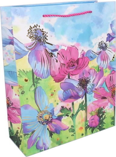 Vibranten potisk s cvetlicami v odtenkih rožnate, vijoličaste in modre doda vsakemu darilu eleganten videz in prazničen pridih.