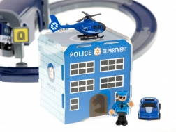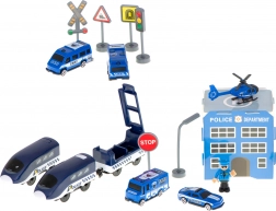 Policijska postaja s heliportom, 4 različna vozila, helikopter, figurica policista in prometna signalizacija – vse za realistične intervencije in učenje pravil cestnega prometa.