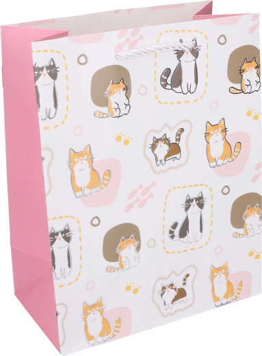 Ta darilna papirnata vrečka z igrivimi mačjimi ilustracijami je idealna za rojstne dneve, praznike in drobna presenečenja. Velikost L (30 × 41,5 × 12 cm) sprejme knjige, igrače, oblačila ali sete manjših daril. Močan papir in kakovostne zvite vrvice zagotavljajo udobno in varno prenašanje.