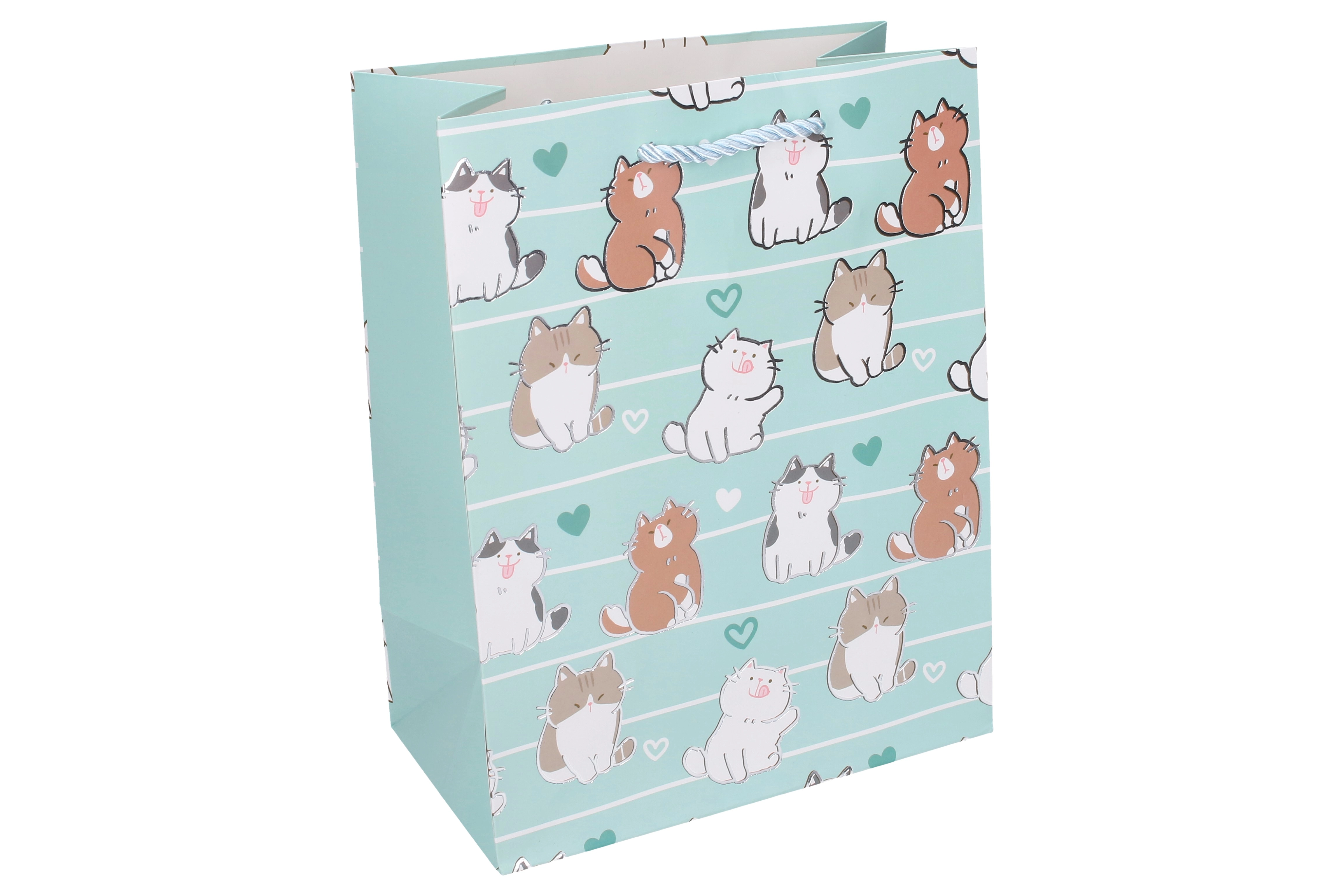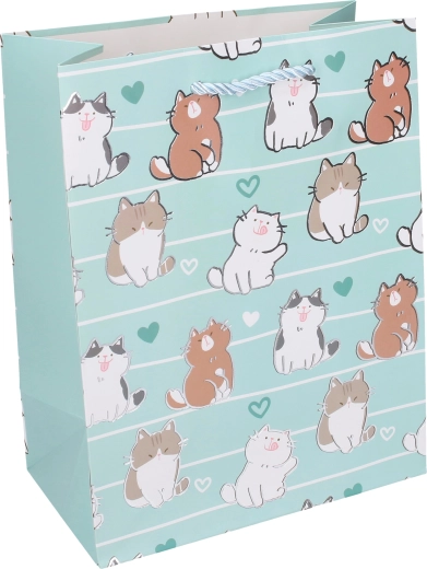 Dizajn z mačkami v več pastelnih različicah deluje prijetno in vsestransko. Zahvaljujoč trdnemu pravokotnemu dnu vrečka stoji sama, zato se zlahka polni, darila pa ostanejo lepo zapakirana. Odlična izbira, ko želite darilu dodati takojšen učinek brez ovijalnega papirja.