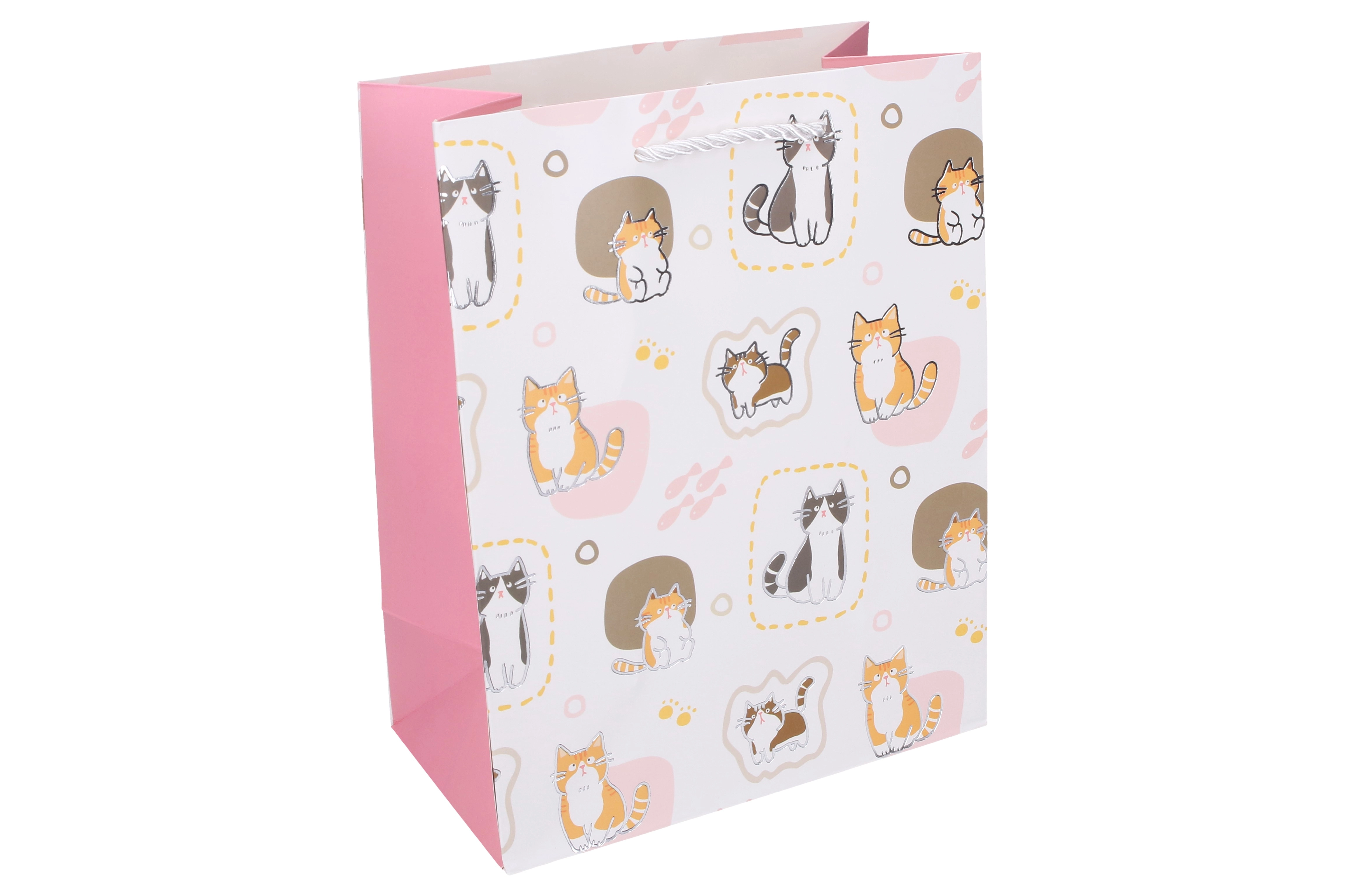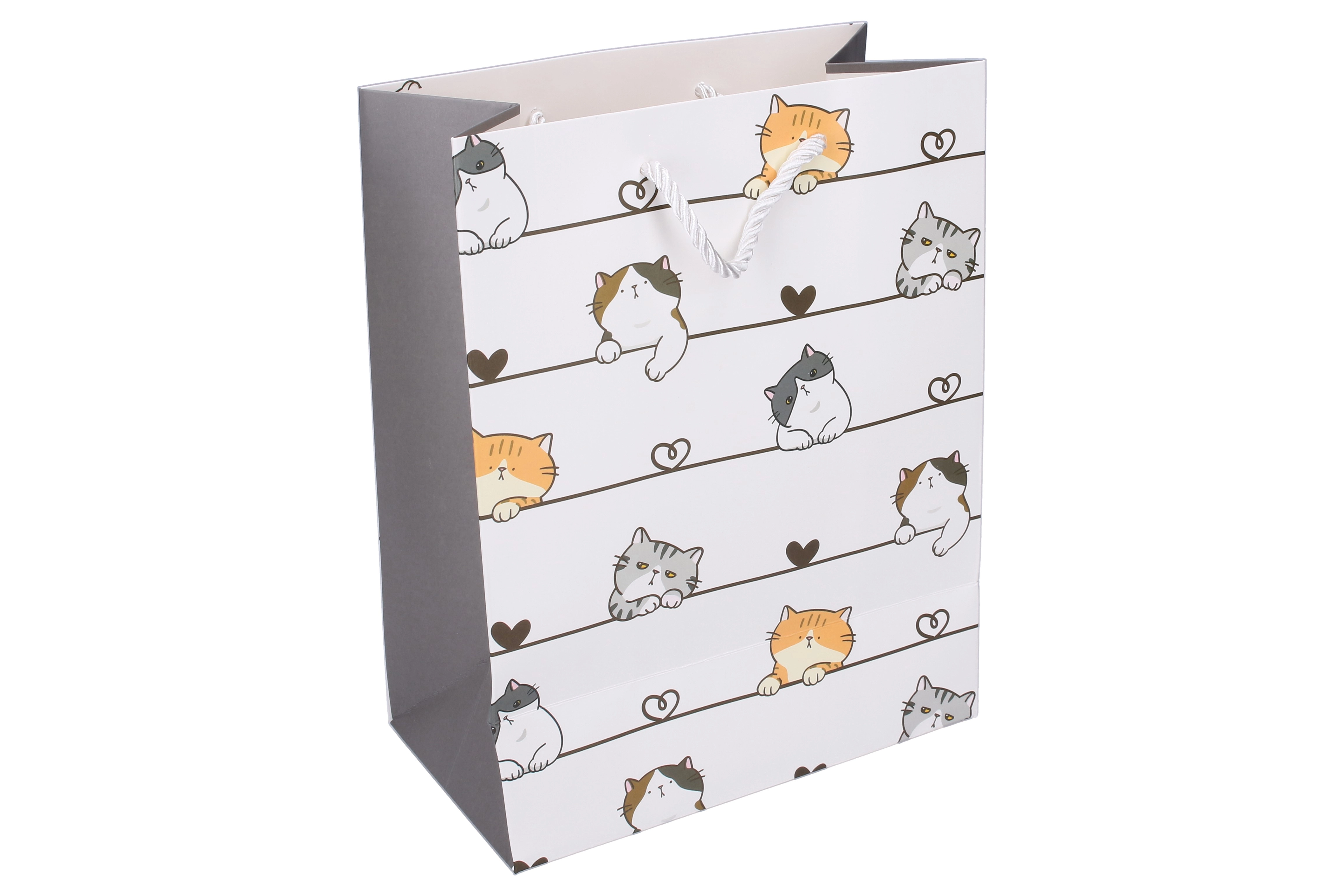 Darilna vrečka z veselimi mačjimi ilustracijami je idealna za zavijanje rojstnodnevnih in prazničnih daril. Zahvaljujoč čvrsti papirnati konstrukciji in ojačanemu dnu zanesljivo prenese lažje do srednje težke drobnarije, igrače ali kozmetiko. Elegantni zviti vrvni ročaji zagotavljajo udobno prenašanje.