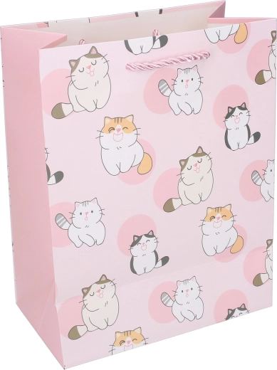 Ta elegantna papirnata vrečka z igrivim potiskom mačk vsakemu darilu doda prisrčen videz. Zaradi kompaktnih mer 18 × 23 × 10 cm je odlična za drobne predmete, kozmetiko, otroške igrače ali sladkarije. Kakovosten papir, sijajen potisk in čvrst vrvičast ročaj zagotavljajo zanesljivo in udobno prenašanje.