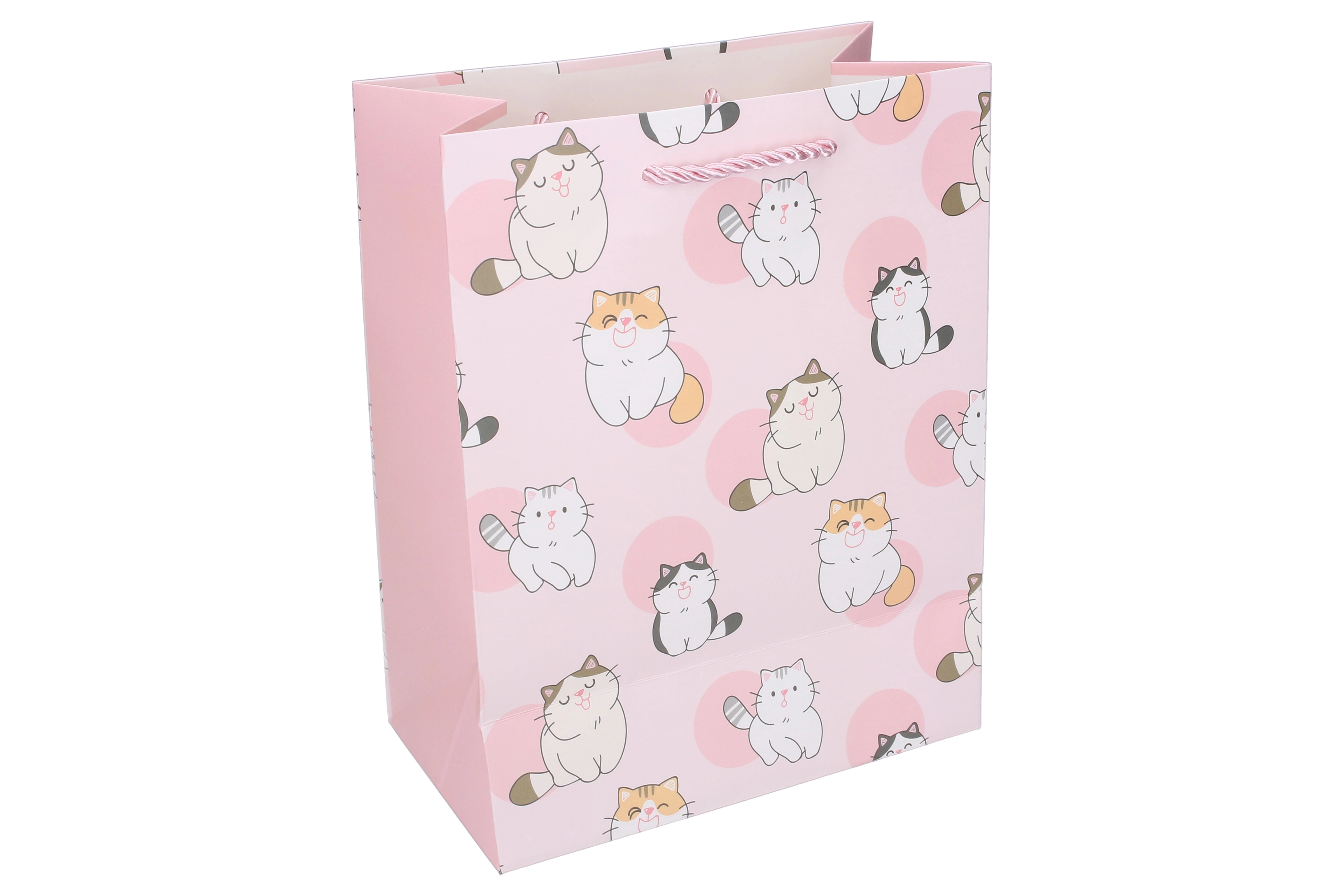 Prisrčna darilna vrečka velikosti S s ponavljajočim se motivom mačk bo razveselila otroke in ljubitelje živali. Ima čvrsto papirnato izvedbo, ojačane robove in vzdržljive vrvičaste ročaje za udobno nošenje. Idealna za manjša darila, igrače in drobnarije, na voljo v več barvnih različicah za stilno in varno zavijanje daril.
