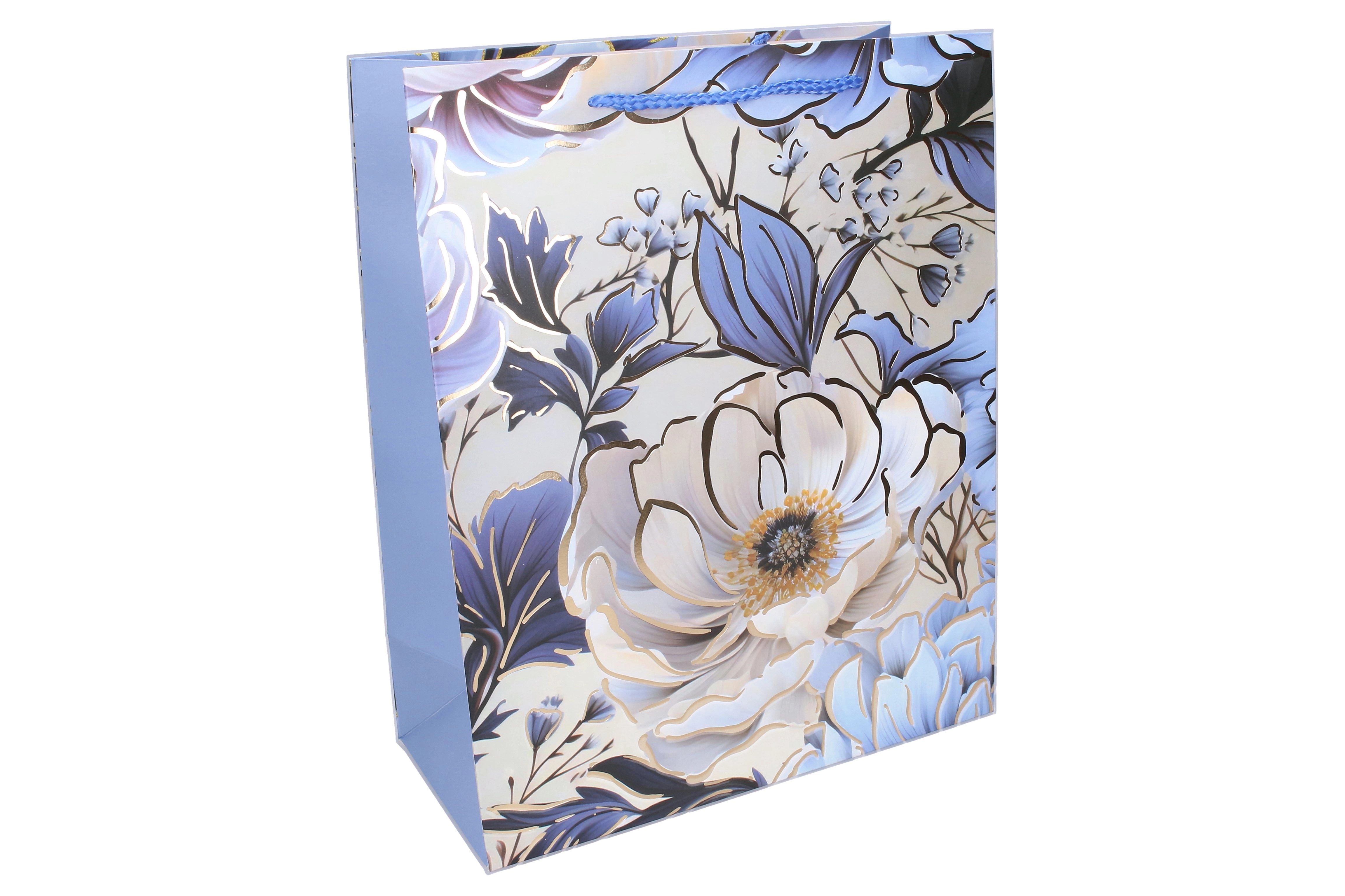 Ta celoletna darilna vrečka v kompaktni velikosti S je odlična izbira za elegantno predajo daril. Kakovosten papir, ojačano dno in stranice ter udobni ročaji zagotavljajo zanesljiv oprijem tudi pri večji obremenitvi. Cvetlični potiski v pastelnih in modrih tonih z nežnimi zlatimi detajli dajejo darilu izjemen videz.