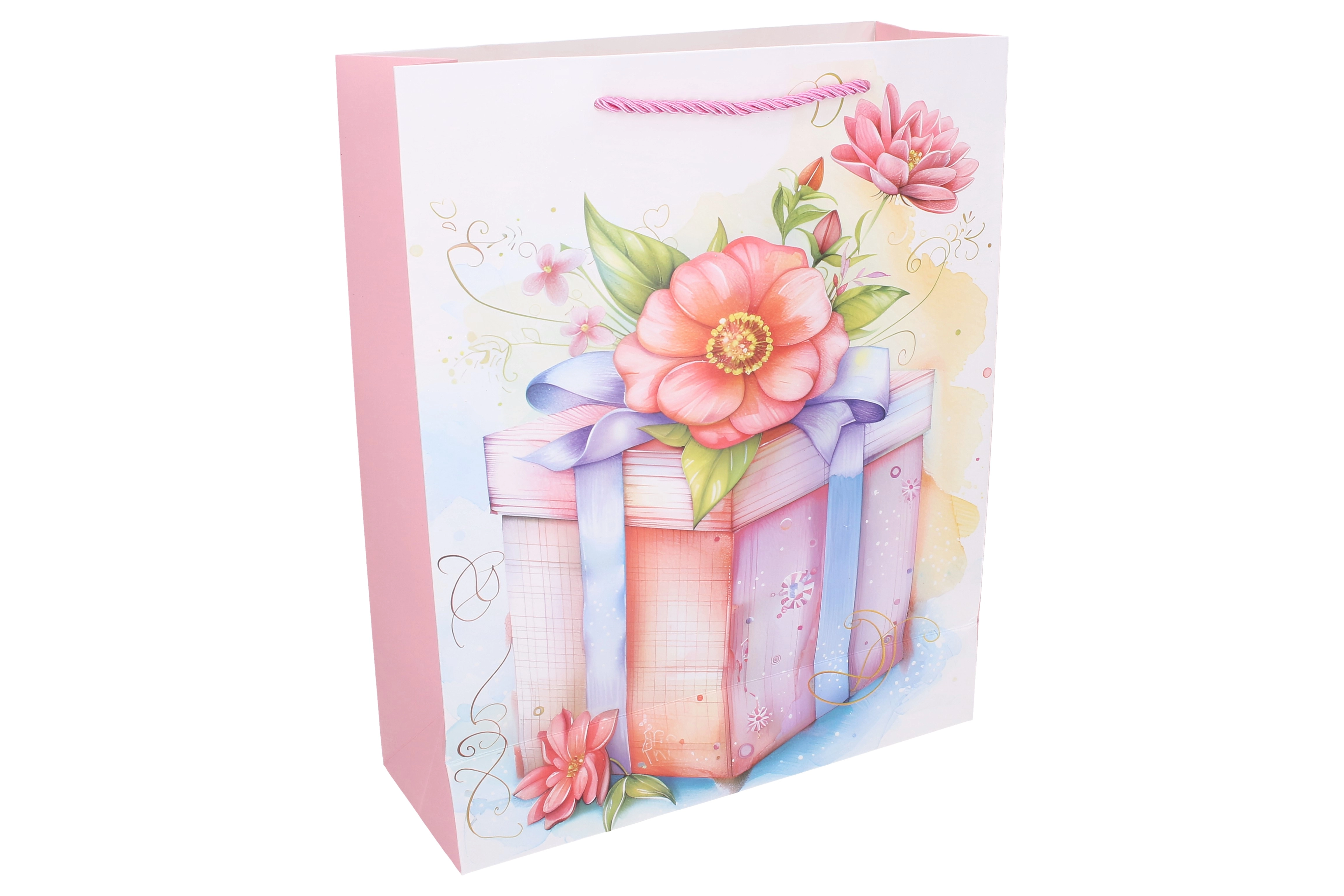 Stilna darilna vrečka velikosti L z merami 30 × 40 × 12 cm je idealna za elegantno zavijanje daril skozi vse leto. Ponuja čvrst vrvičast ročaj, kakovostno papirnato izvedbo in nežne pastelne motive s cvetlicami in darili, kar iz nje naredi reprezentativno embalažo za vsako priložnost.