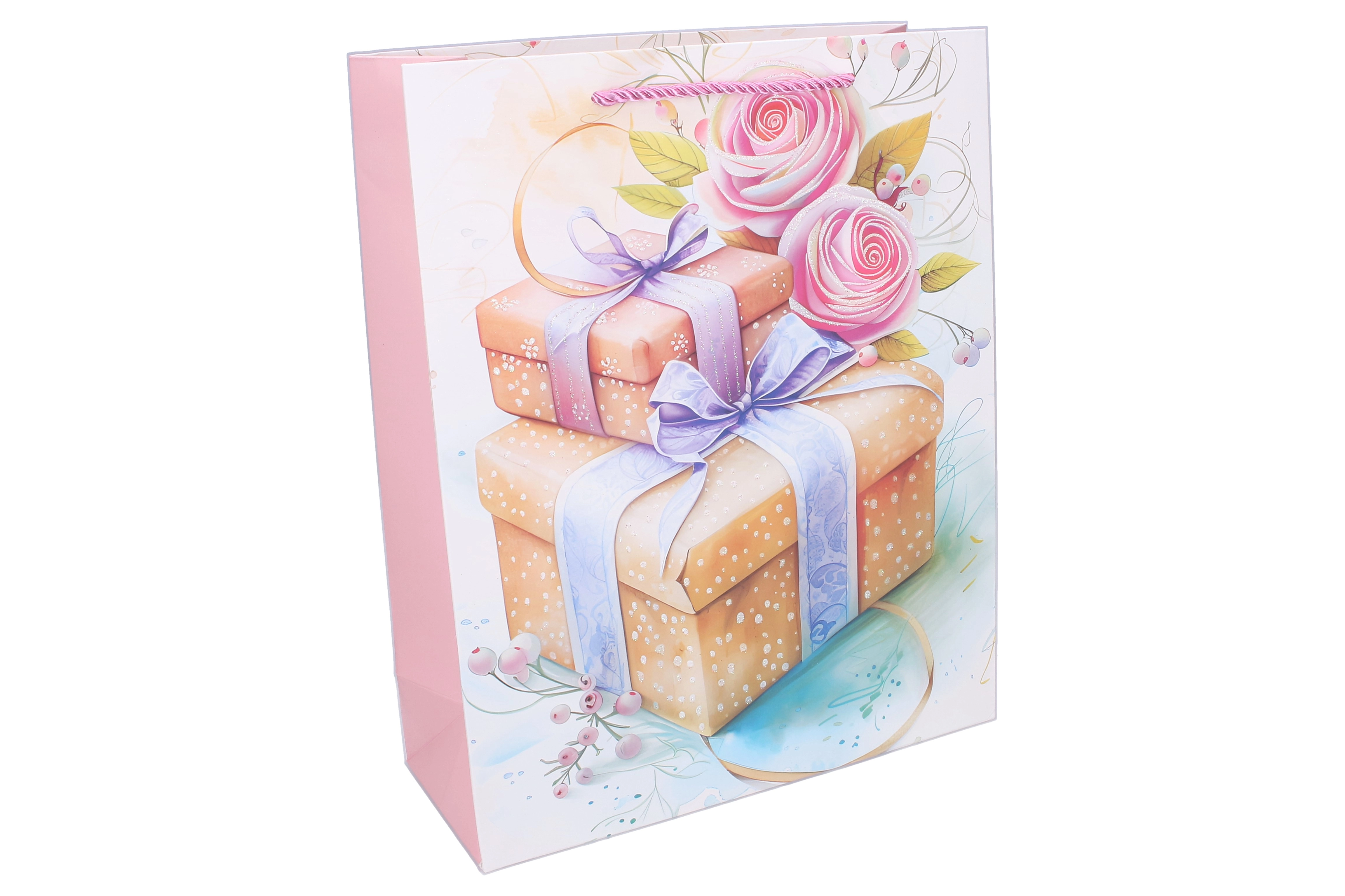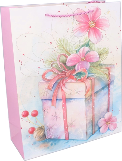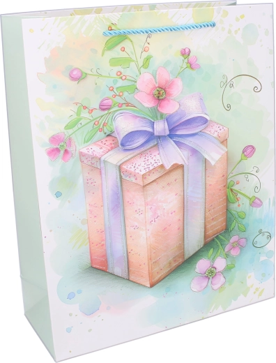 Stilna darilna vrečka bo zanesljiv pomočnik za rojstne dneve, praznike, poroke in drobne pozornosti skozi vse leto. Univerzalen celoletni motiv s paketki, cvetlicami in pentljami deluje nežno in elegantno, zato je primeren za ženske in dekleta ter za širok nabor priložnosti.