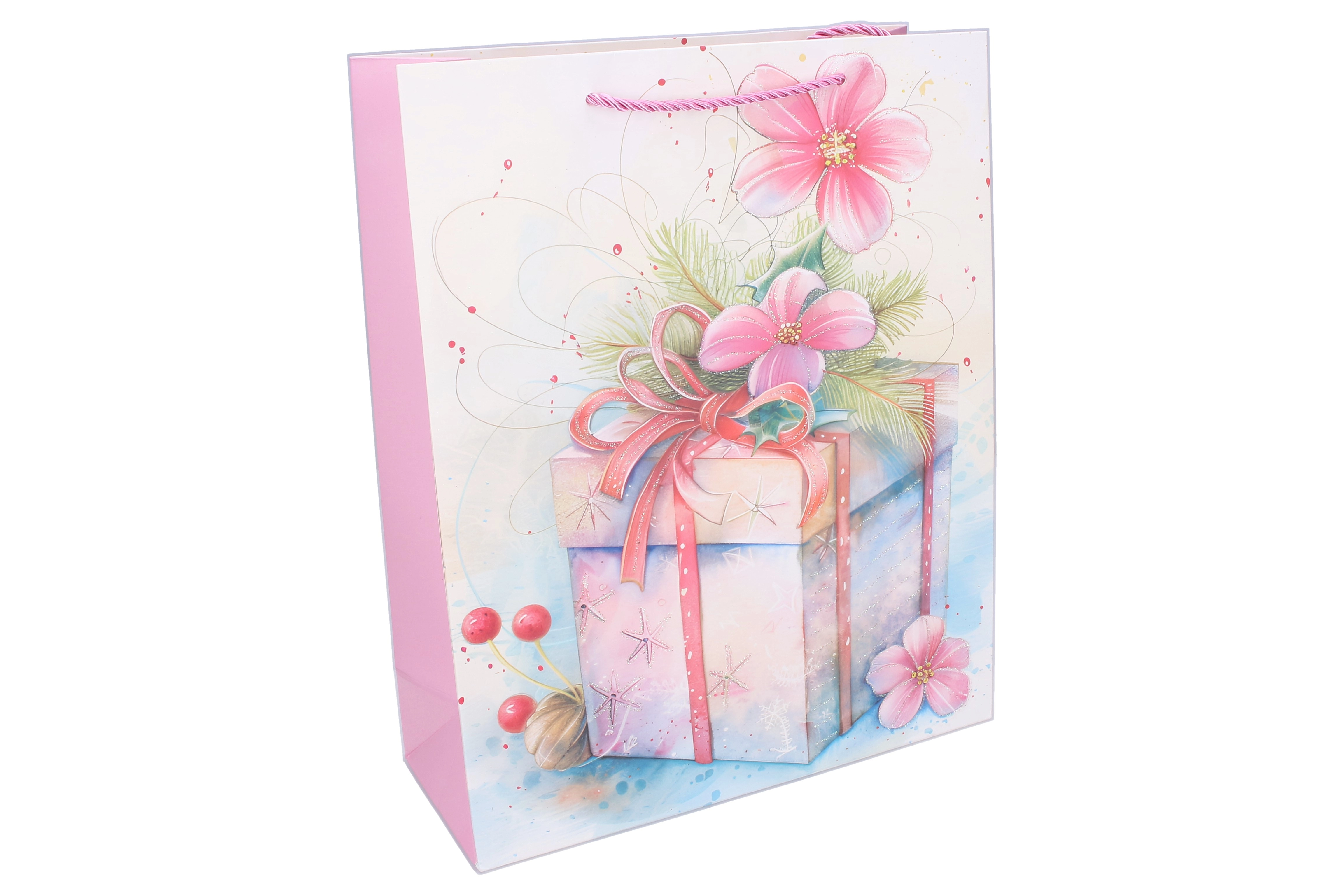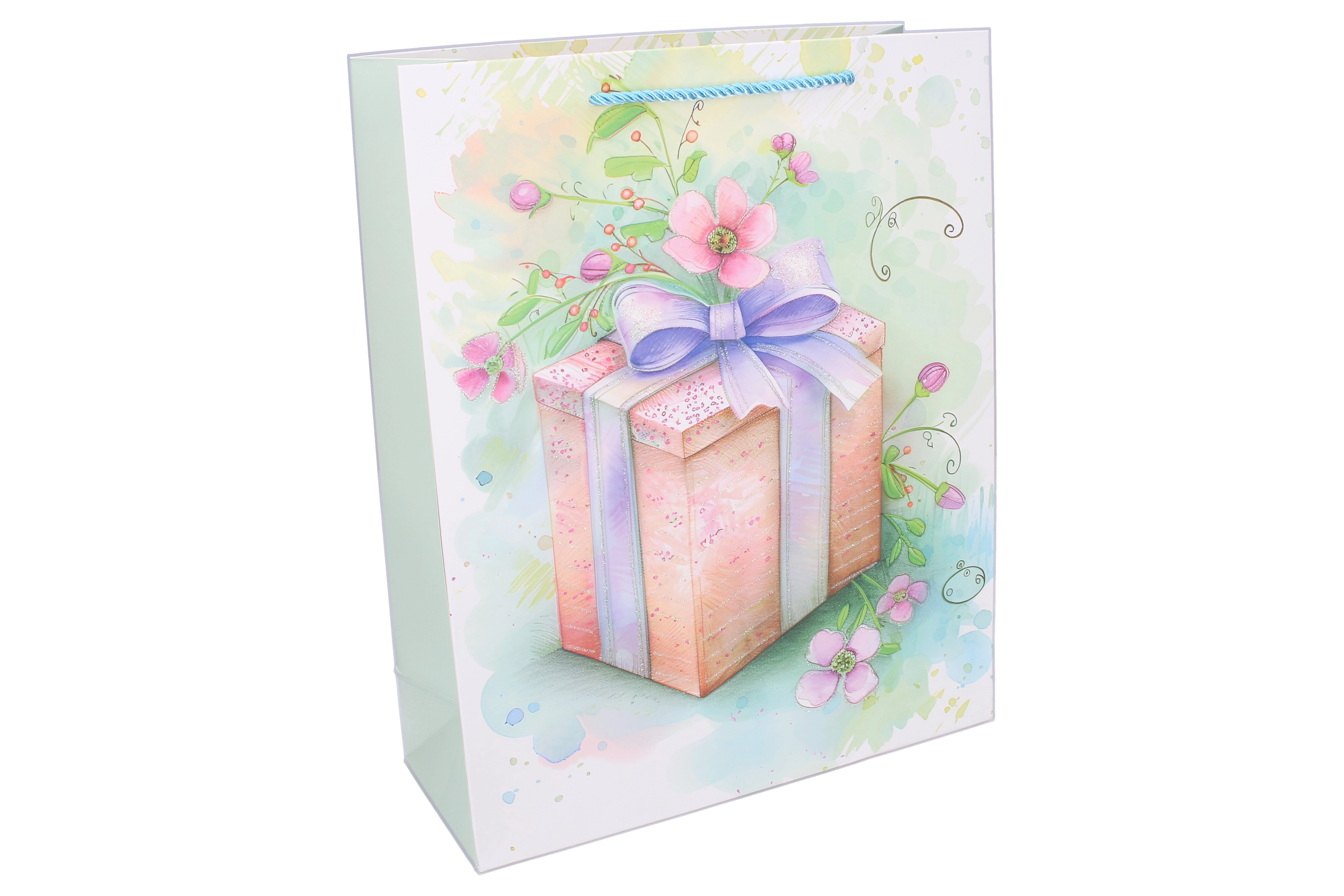 Zaradi praktičnih mer 26 × 32 × 10 cm vrečka varno prenese srednje velika darila. Čvrsti zasukani ročaji olajšajo prenašanje, kakovosten papir z ojačanim dnom pa pomaga ohranjati obliko. Bleščeč tisk in pastelne barve poudarijo slovesen vtis brez potrebe po dodatnem ovijalnem papirju.