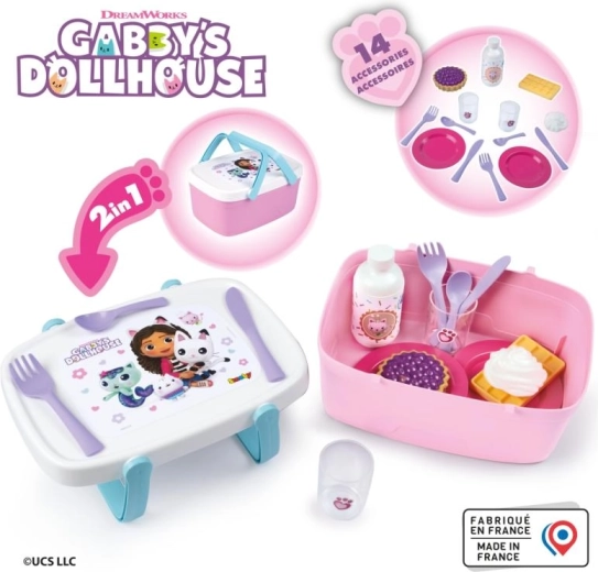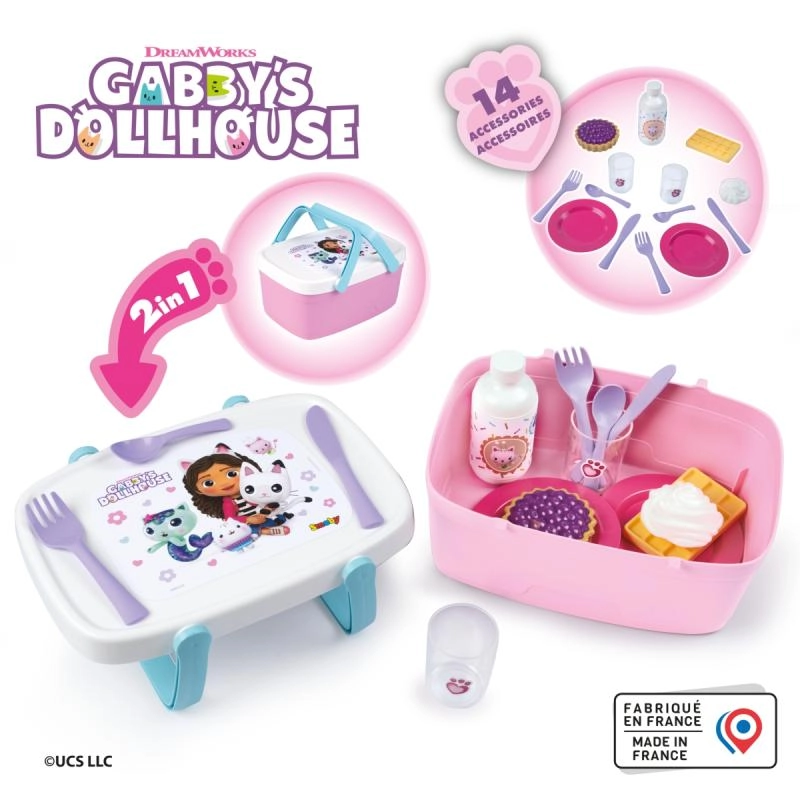 Ta ljubek piknik koš 2 v 1 prinaša otrokom ure ustvarjalne zabave. Po spuščanju ročajev na pokrovu se spremeni v priročno mizico, na kateri lahko mali gostitelji strežejo pijače in dobrote. Tematski dizajn GABBY’S DOLLHOUSE bo razveselil vse oboževalce priljubljene serije.