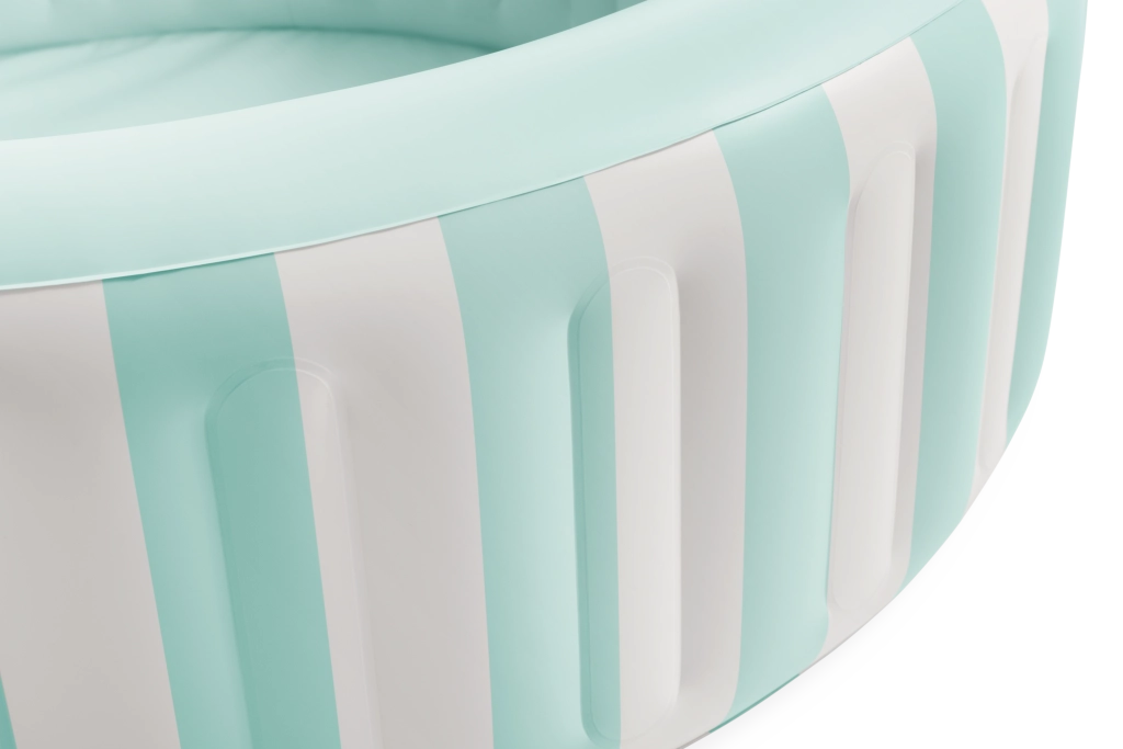 Napihljiv bazen Coastal Luxe v sodobnem obmorskem dizajnu je idealen za poletne vodne igre mlajših otrok. Navpične črte v svetlo turkizni in beli barvi delujejo sveže, medtem ko gladka notranja površina v nežni turkizni barvi ustvarja občutek čistosti in miru. Trpežen PVC in večkomorne stene zagotavljajo stabilnost ter udobje pri sedenju in igri.