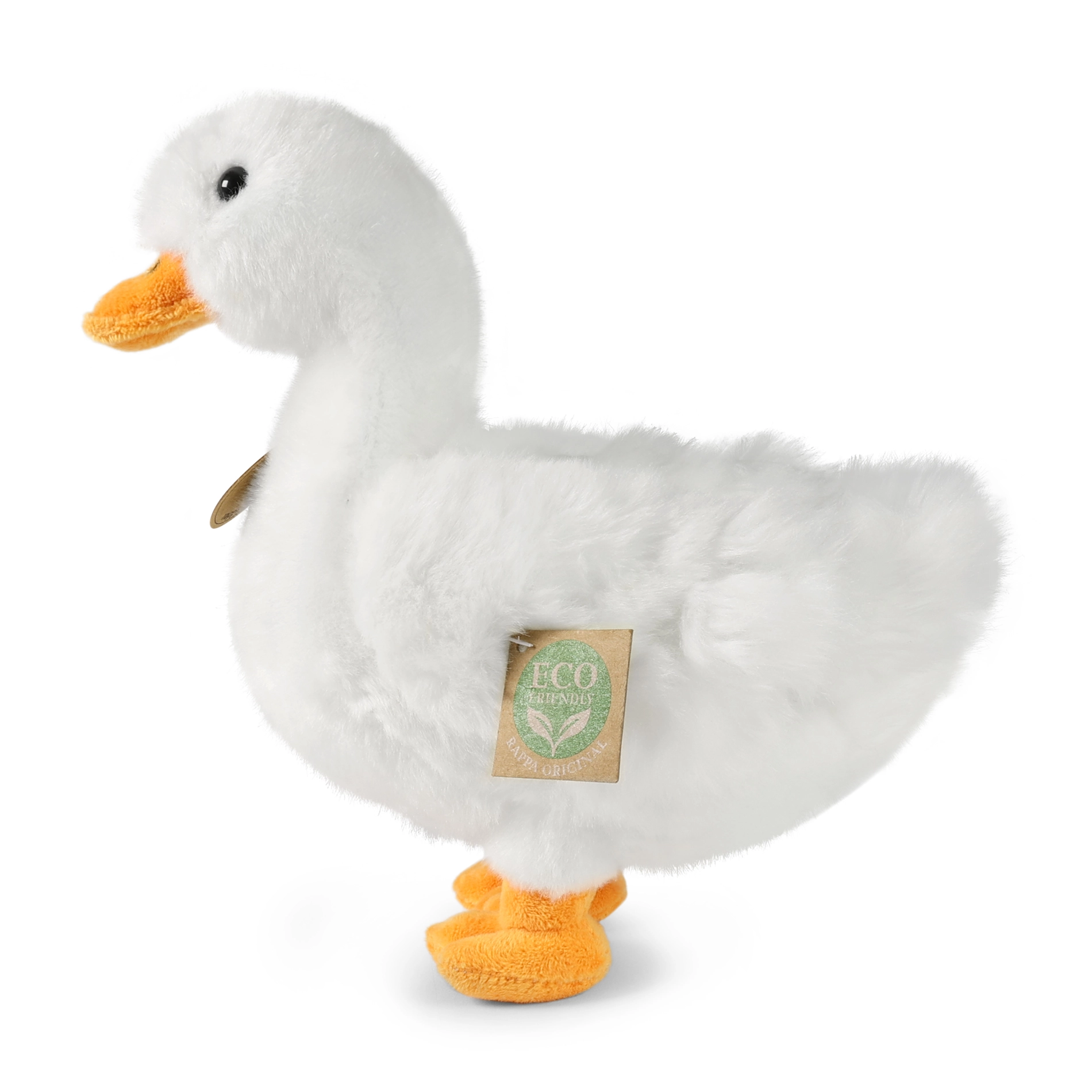 Ljubka bela plišasta raca velikosti 24 cm iz prestižne kolekcije RAPPA je izdelana iz kakovostnih in okolju prijaznih ECO materialov. Zaradi ročne izdelave deluje kot prava, je izjemno mehka in nežna za crkljanje ter ima varno polnilo iz recikliranih PET plastenk, primerno tudi za najmlajše otroke od rojstva naprej.