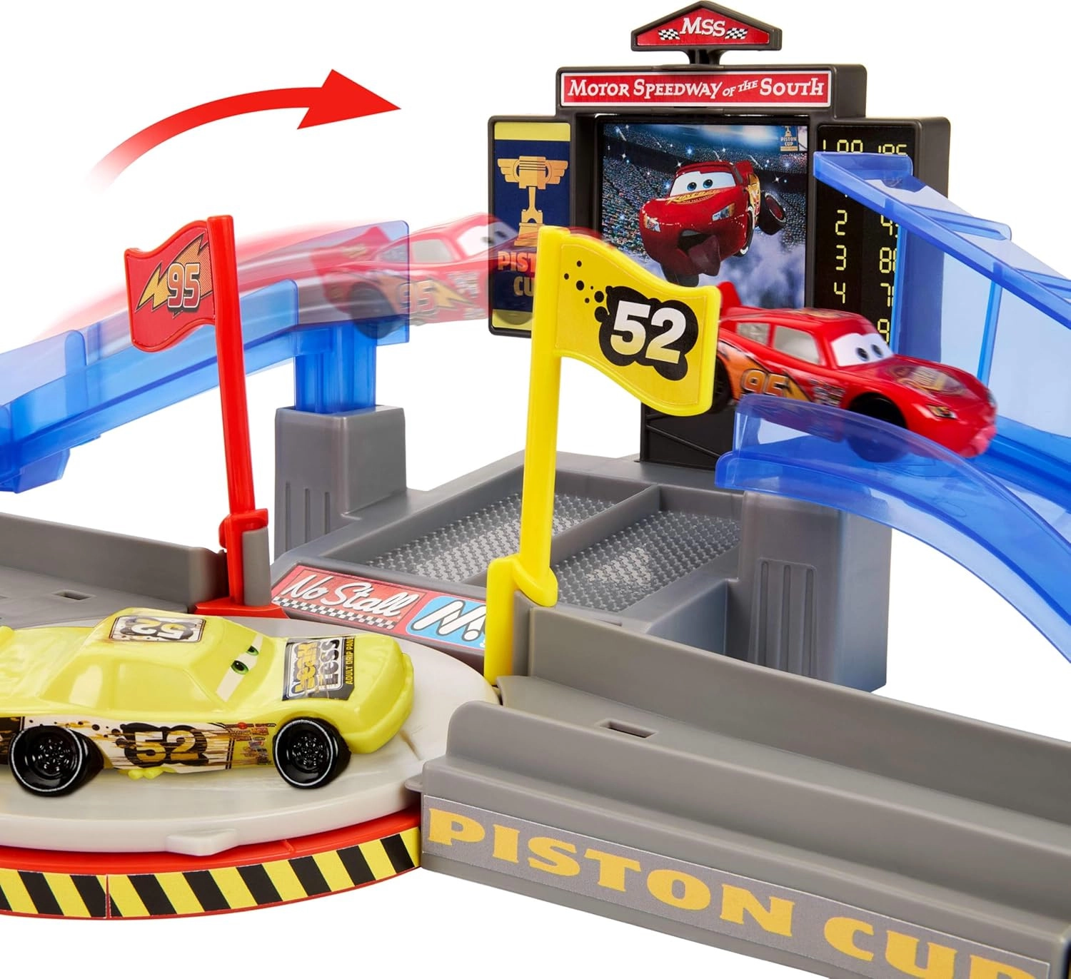 Doživite filmske trenutke kar doma. V načinu razbitja zavrtite rumeni znak in pripravite območje trčenja. Postavite Strelo McQueena v izstreljevalnik in namerite – pravi odpal pomeni tekočo vožnjo brez ovir, sicer pride do efektnega trka z »zmečkanim« avtom. V dirkalnem načinu preklopite izogibališče, izstrelite po rampi in opazujte odličen kaskaderski skok. Vrtljivi zaslon prikaže junaka na »telebimu« za še večje napetosti.