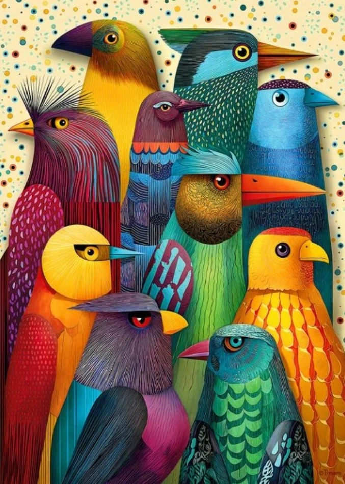 Uživajte v sprostitvi ob sestavljanju puzzla z motivom Ptičji klub, ki združuje fine detajle, živahne barve in skrbno oblikovane kose. Odlično kot darilo, za domače udobje ali kot dekoracija po lepljenju in uokvirjanju.