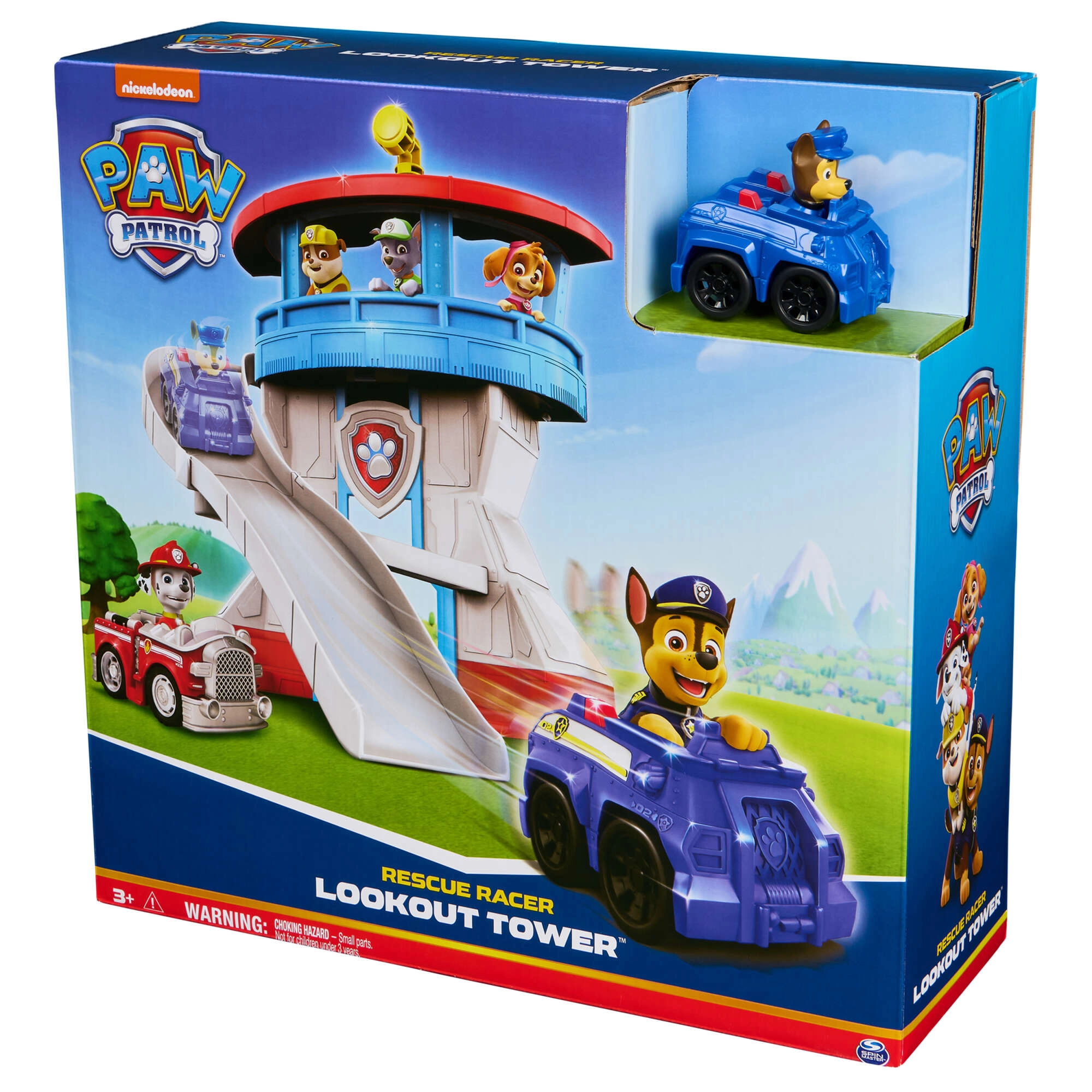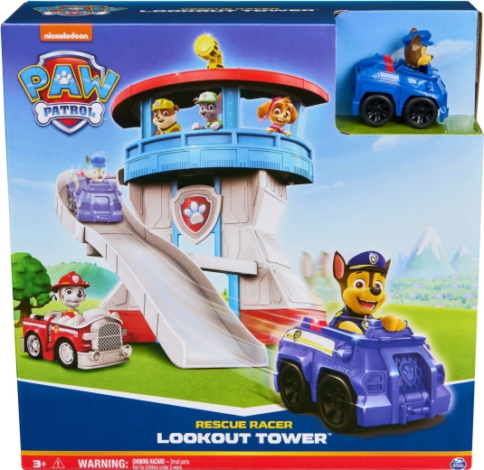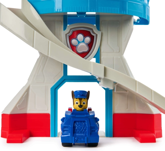 Ta barvit igralni set, navdihnjen s serijo Paw Patrol, otrokom ponuja realistično bazo za njihove reševalne scenarije. Stolp krasi ikonična pasja značka, na vrhu pa je vrtljiv rumen periskop, s katerim lahko Chase nadzira okolico. Del kompleta je tudi kompaktni modri avtomobilček s figurico Chase – pripravljen na hiter spust po ukrivljenem toboganu.