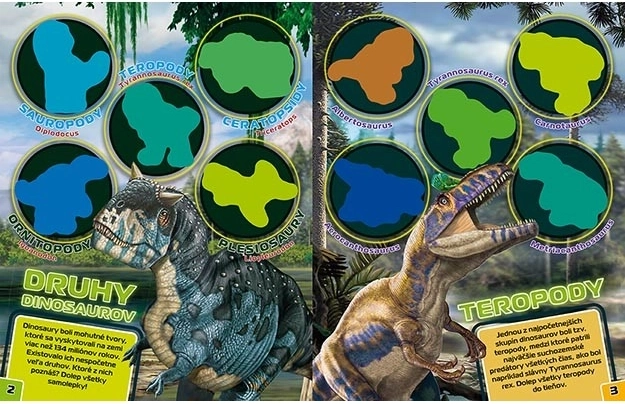 Odkrijte čar prazgodovine z nalepkasto knjižico, ki bo navdušila vsakega otroka. Izbrane nalepke imajo fosforescentne robove, zato po ugasnjenih lučeh nežno žarijo in oživijo vsako prizorišče z dinozavri.