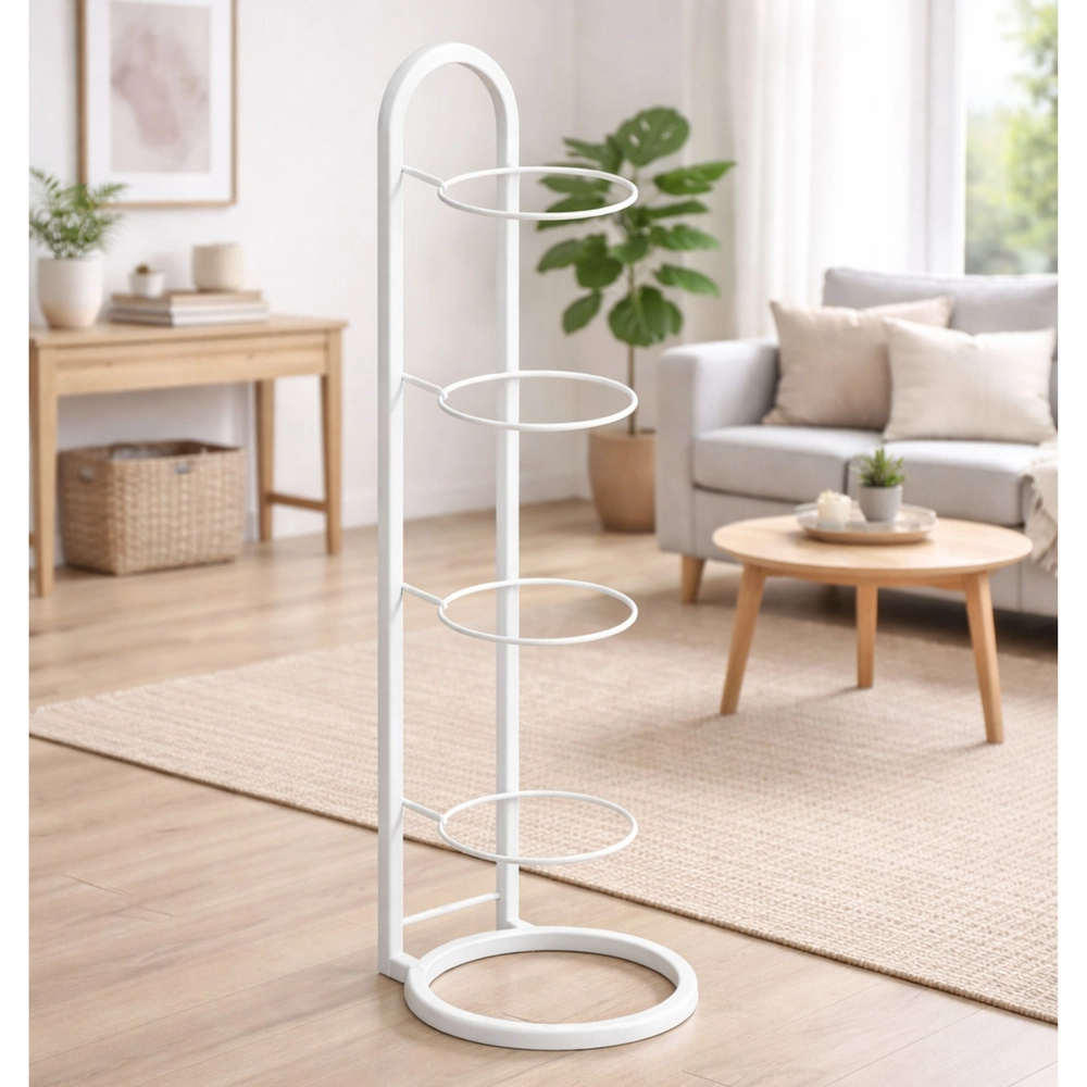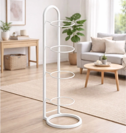 Ohranjajte red v športni opremi z vitkim stojalom s 4 samostojnimi obroči. Stabilna krožna osnova in robustno jeklo zagotavljata zanesljivost pri vsakodnevni uporabi, bodisi v veži, igralnici, domači telovadnici, šoli ali klubu. Bela barva se zlahka poda k modernim interierjem.