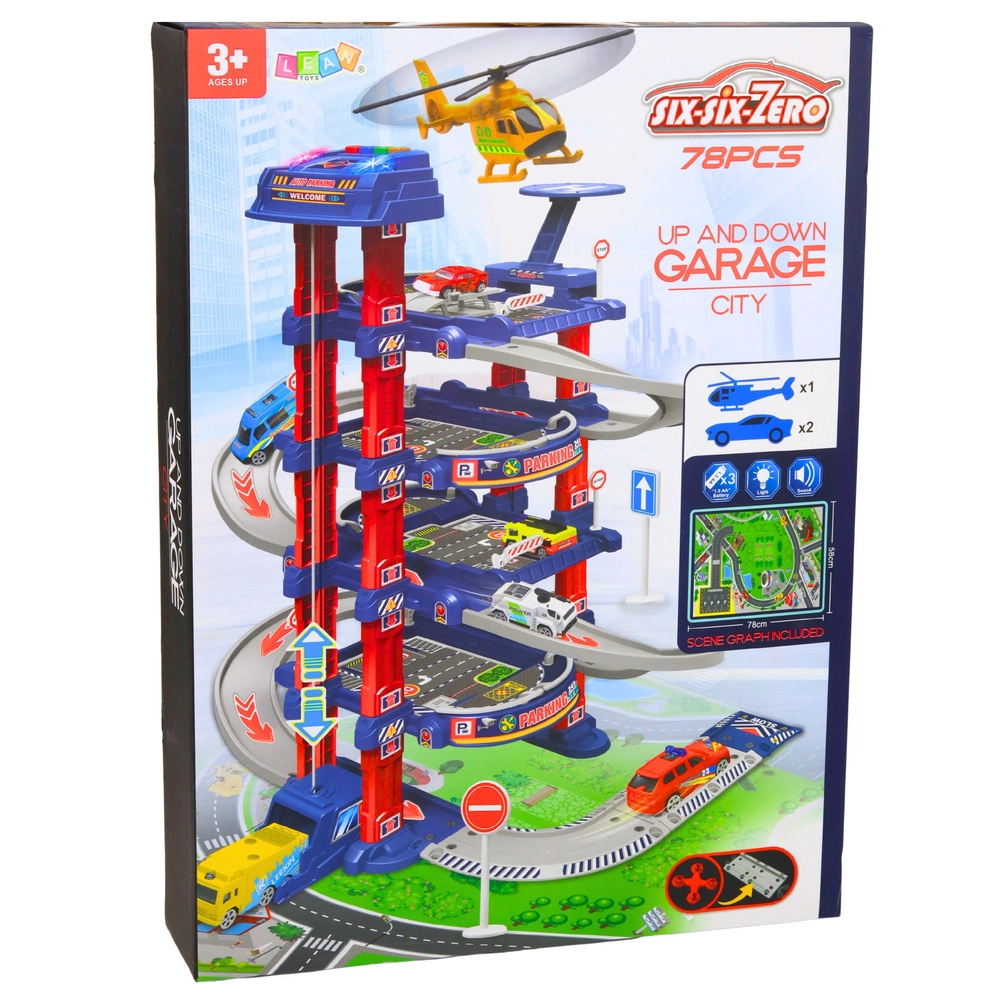 Veliko otroško parkirišče je zasnovano za male ljubitelje avtomobilčkov in mestnega prometa. Električno dvigalo zlahka dvigne avtomobilčke v višja nadstropja, od koder se lahko spustijo po spustni stezi. Del kompleta je tudi pristajalna ploščad za helikopter, prometni znaki in talna igralna podloga, ki ustvarjajo verodostojno mestno okolje.