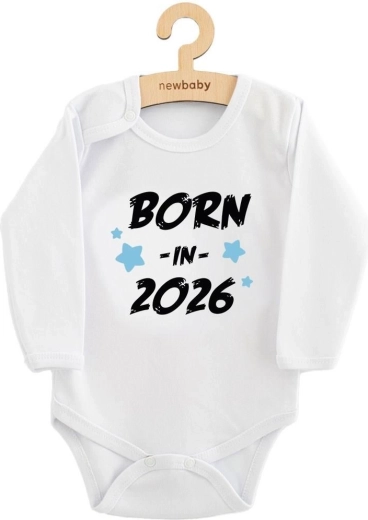 Stilski dojenčkov bodi z dolgimi rokavi NEW BABY Born in 2026 je izdelan iz 100 % bombaža za maksimalno udobje in nežnost do občutljive kože. Praktični pritiskači na rami in v razkoraku olajšajo oblačenje in previjanje. Potisk je narejen z certificiranimi barvami, primernimi za dojenčke, zato se lahko zanesete na varnost in kakovost.