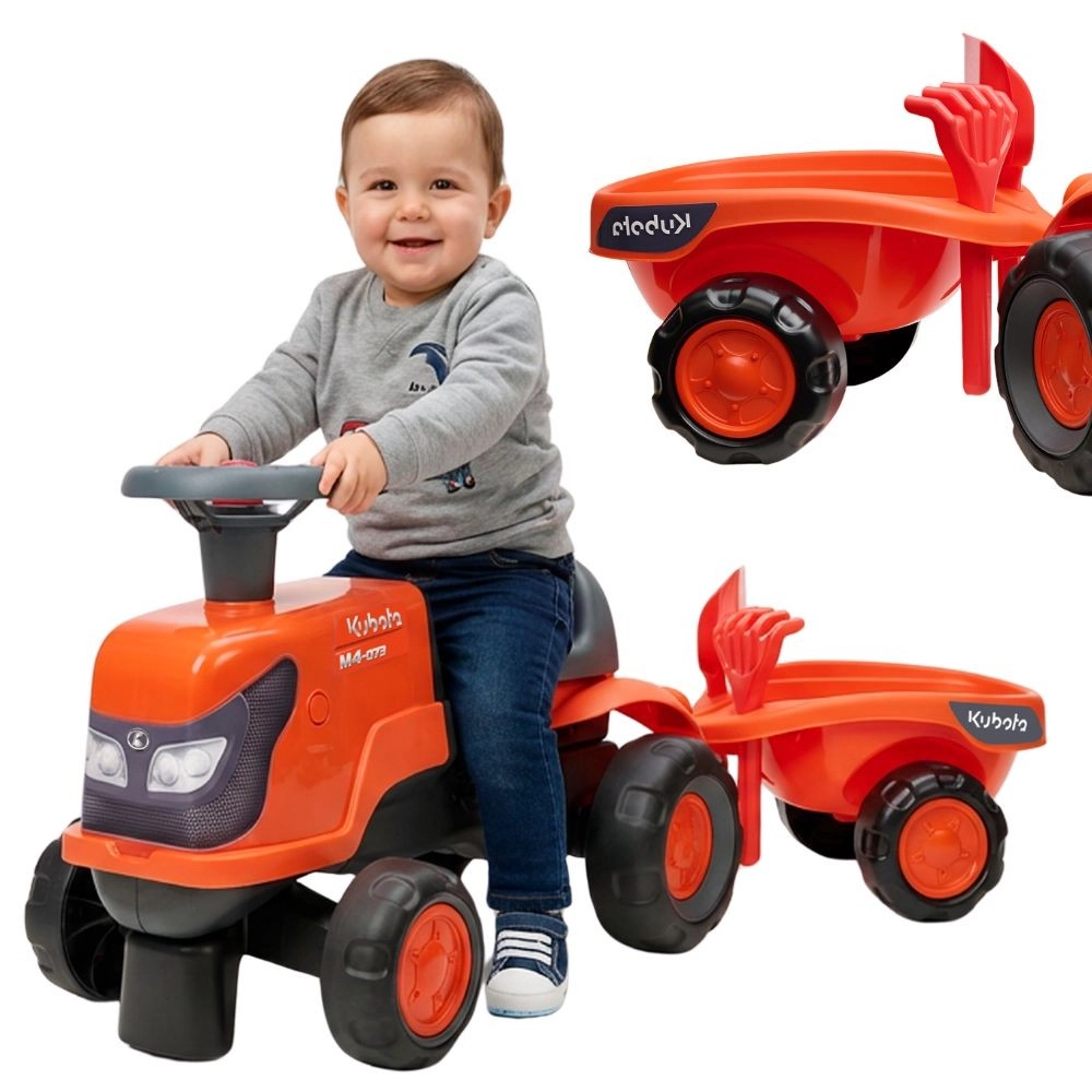 Prisrčen poganjalni traktorček FALK KUBOTA za najmlajše vrtnarje prinaša varno zabavo doma in na prostem. Ima tiha kolesa, volan s hupo, mini prikolico in peskovni komplet (grablje in lopatko). Izdelan v Franciji iz 40 % reciklirane plastike, z zaobljenimi oblikami in živahnimi barvami. Priloženi sta 2 kompleta nalepk za personalizacijo, vključno z lastno registrsko tablico.