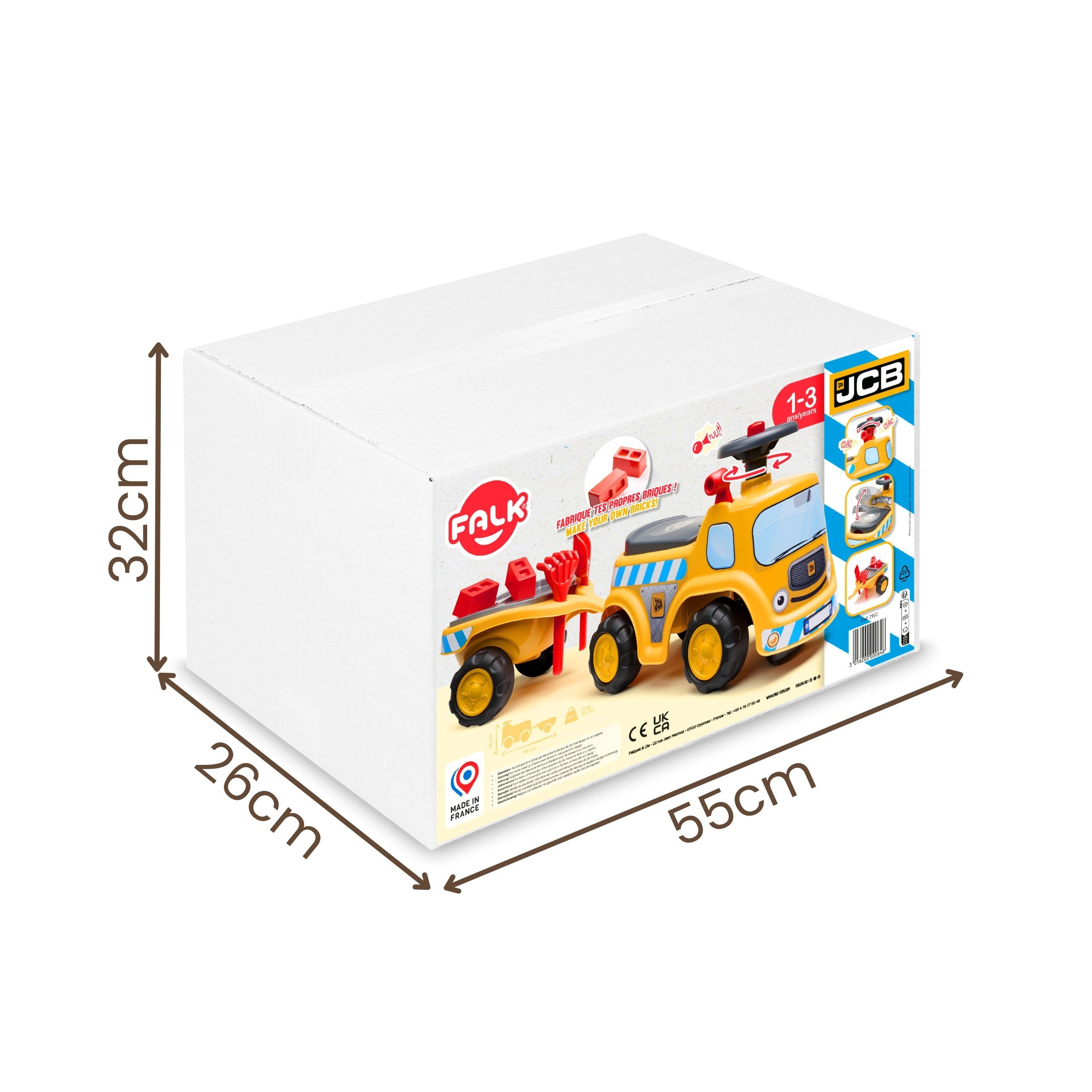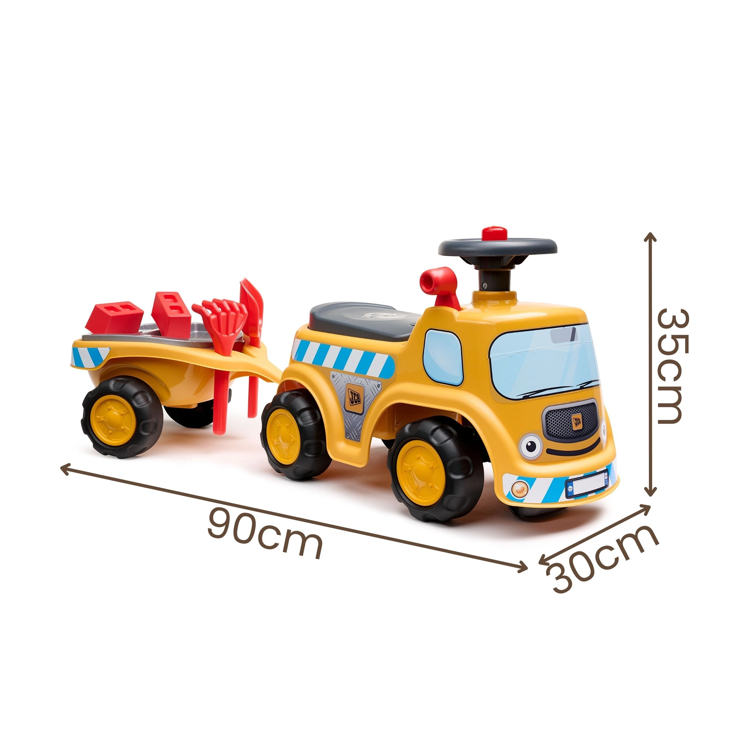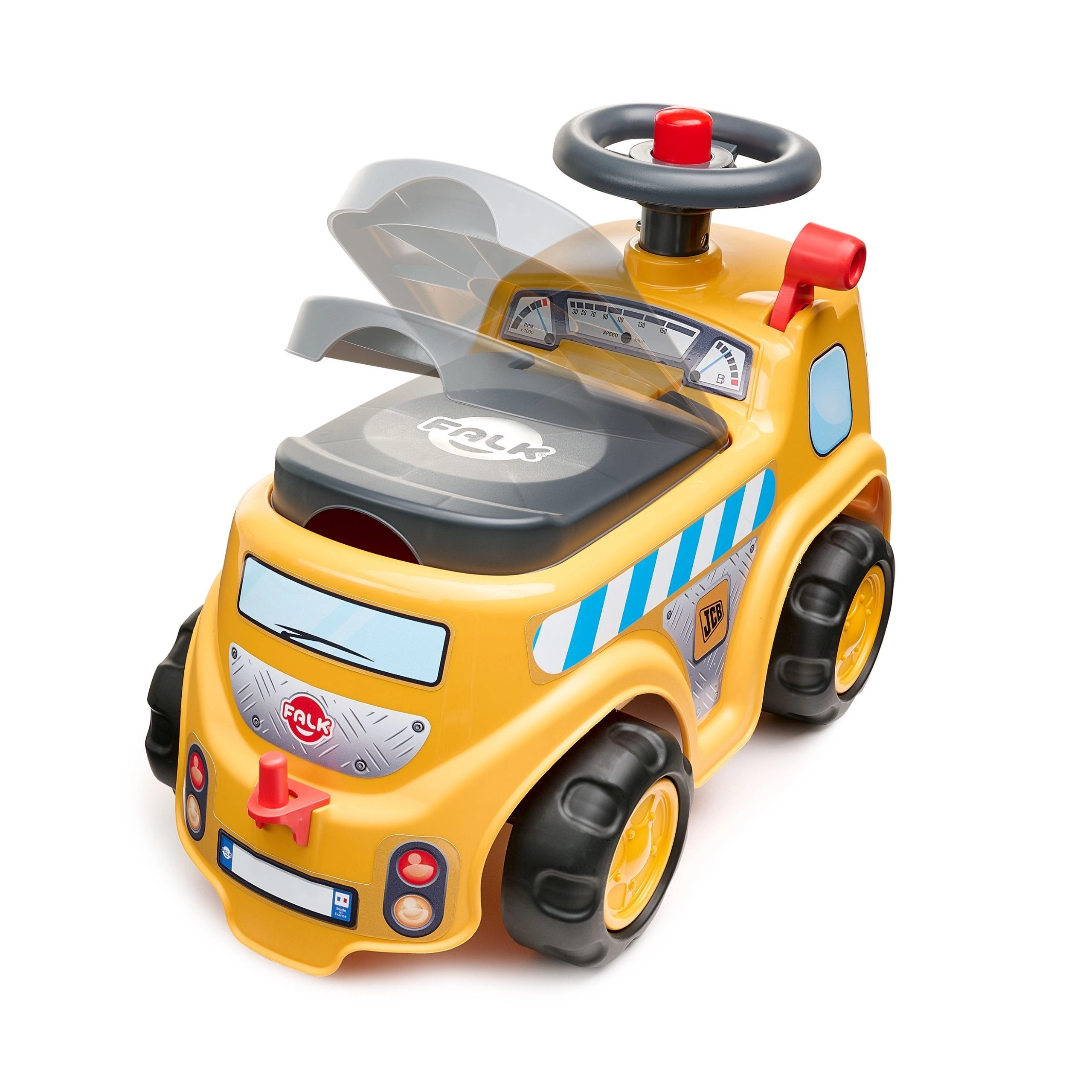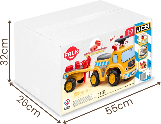 Robusten poganjalec v slogu gradbenega tovornjaka JCB znamke Falk bo razveselil male gradbenike, stare od 1 do 3 let. Ponuja stabilno in varno konstrukcijo, krmilo z zvokom hupe, shranjevalni prostor pod sedežem ter odstranljivo prikolico z orodjem in kockami za domišljijsko igro doma in na prostem.