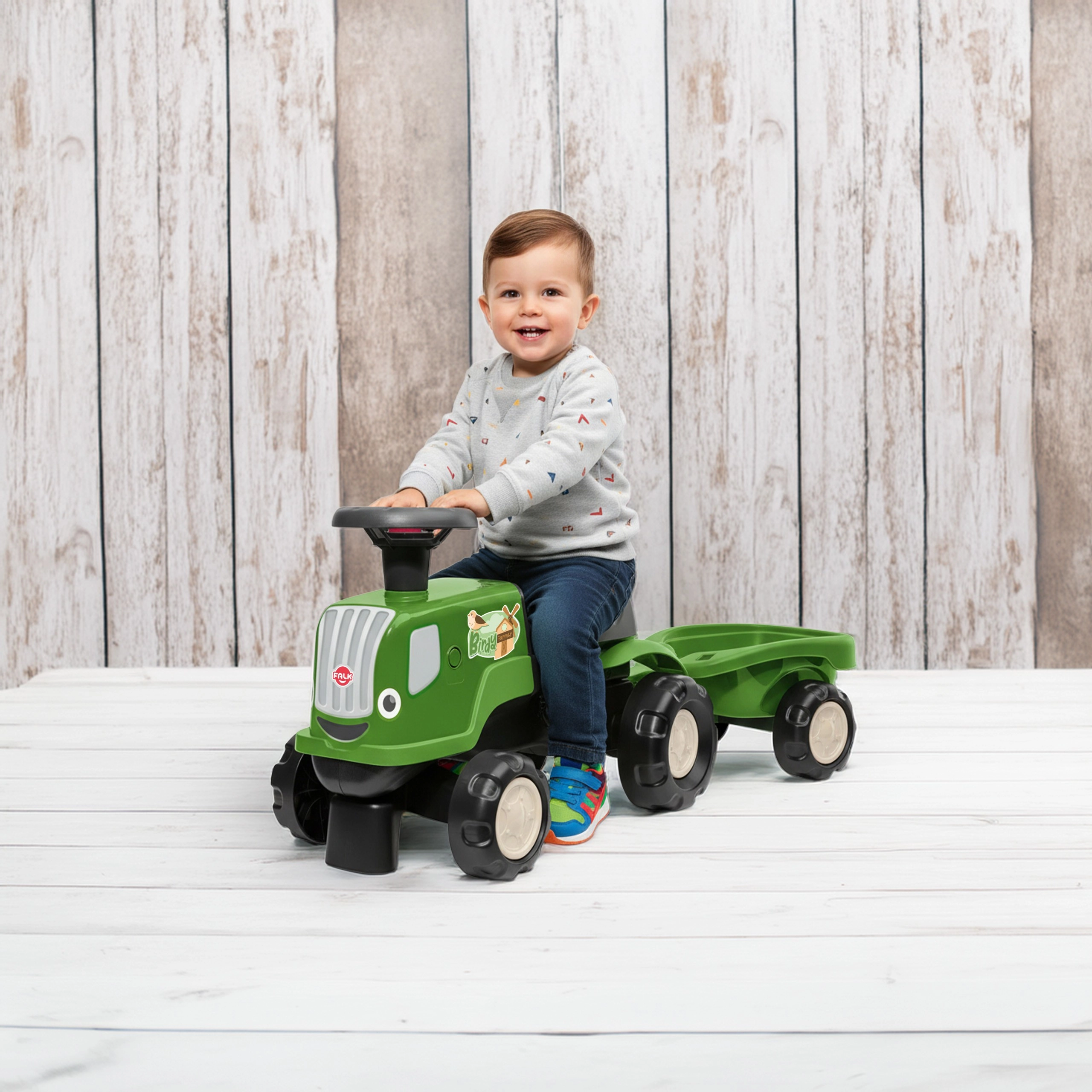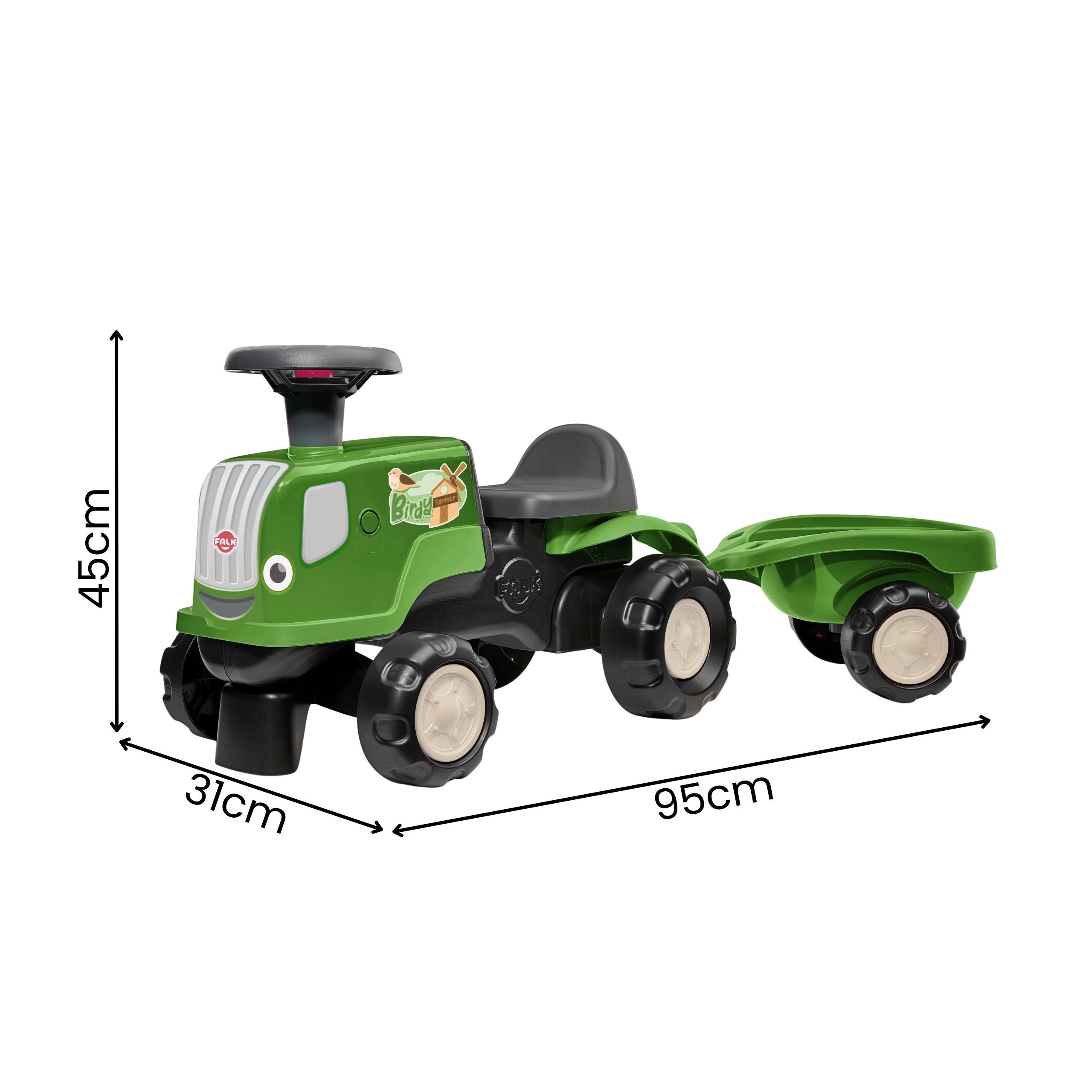 Zeleni poganjalnik traktor FALK BIRDY FARM z odstranljivo prikolico je idealno prvo vozilo za otroke od 1 do 3 let. Ponuja stabilno konstrukcijo, vrtljiv volan za lahko upravljanje in je izdelan iz do 90 % reciklirane plastike. Nizka teža olajša poganjanje, udoben sedež z naslonom pa povečuje udobje in varnost pri vožnji doma in na vrtu.