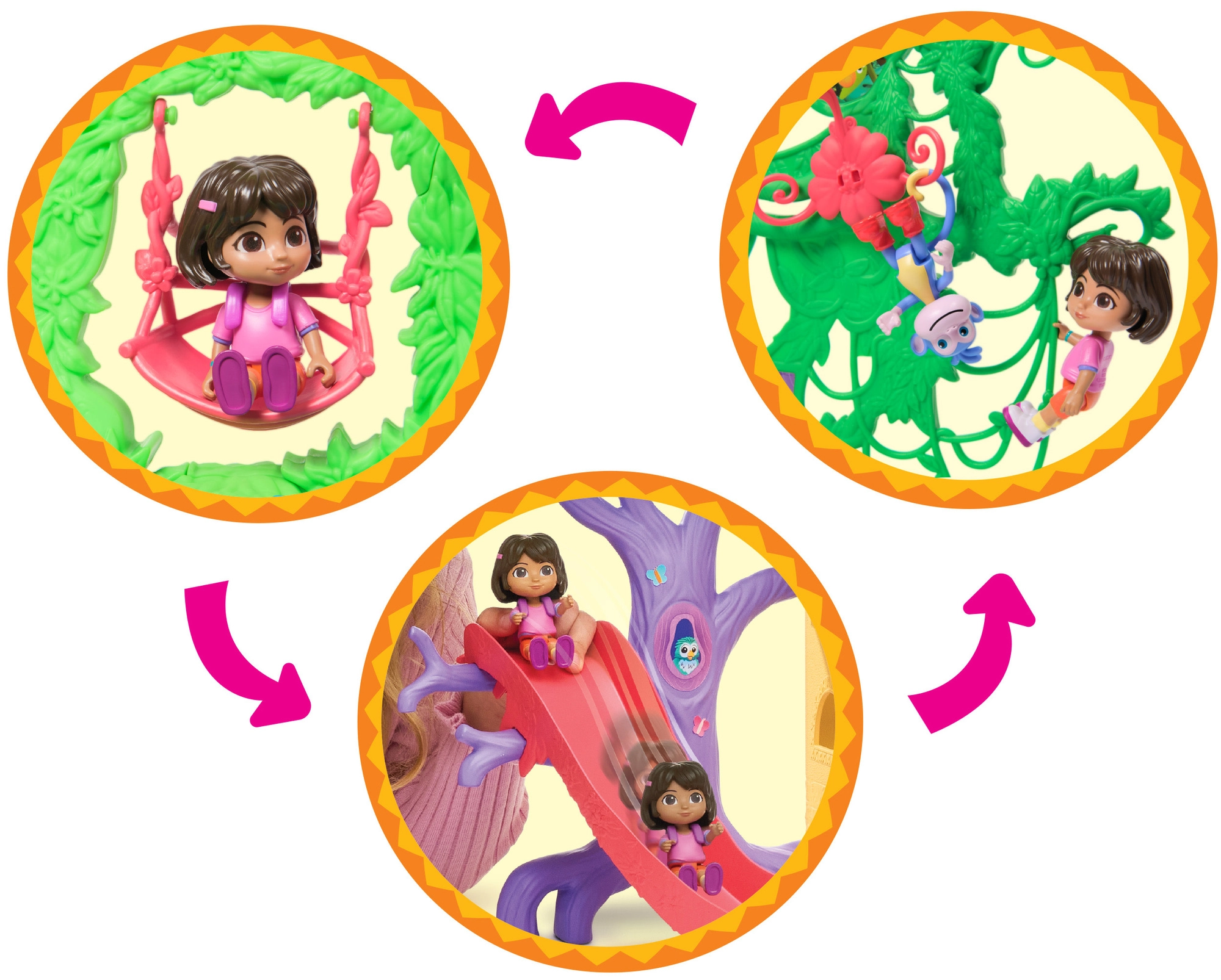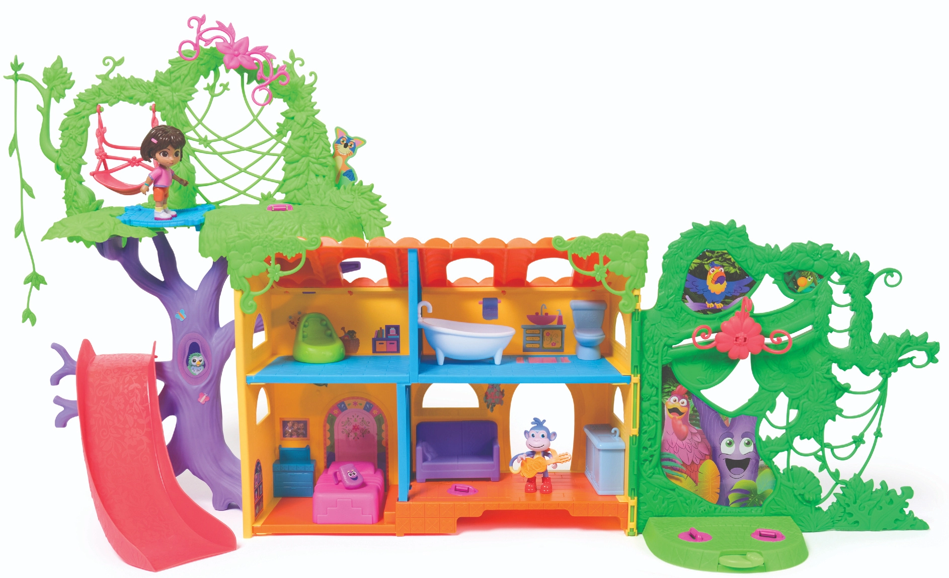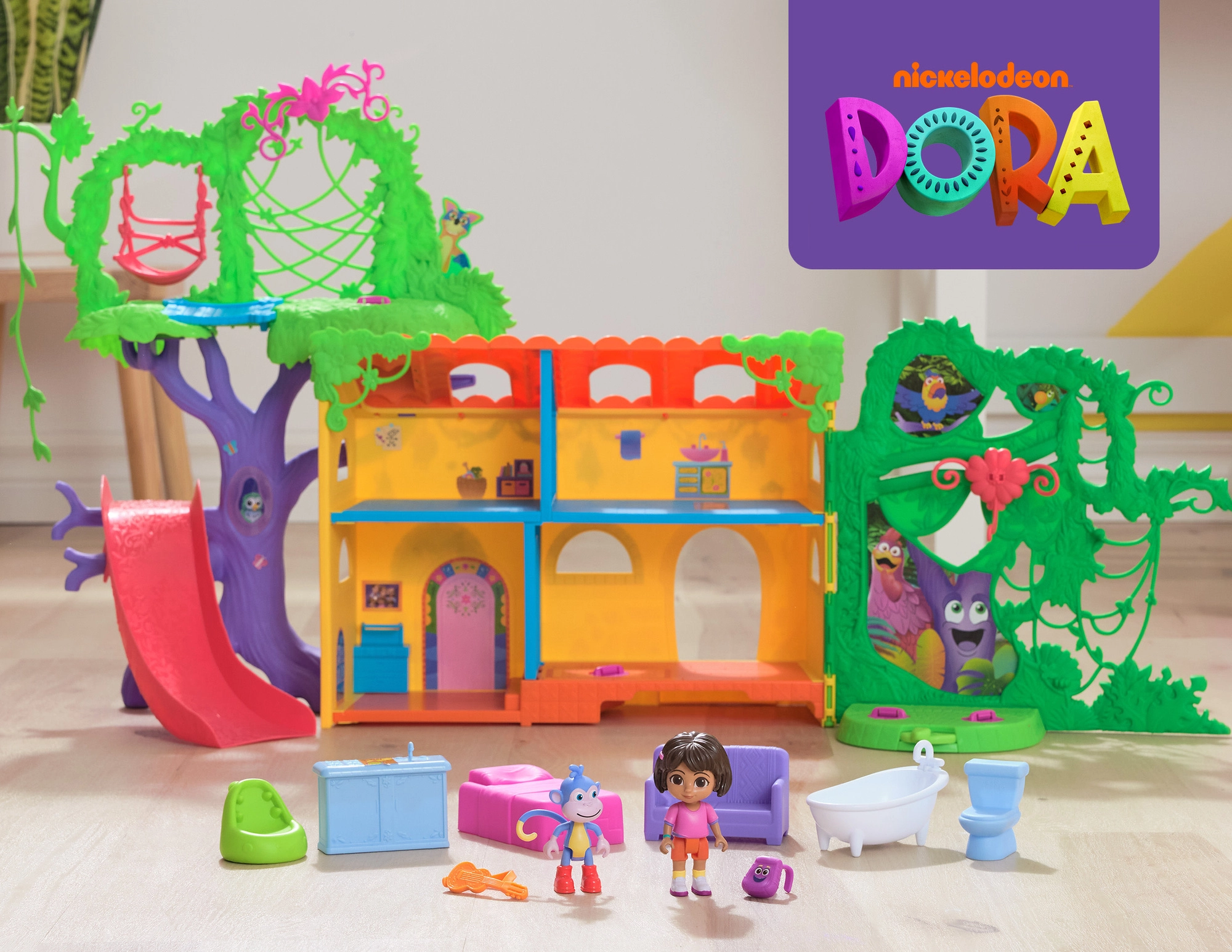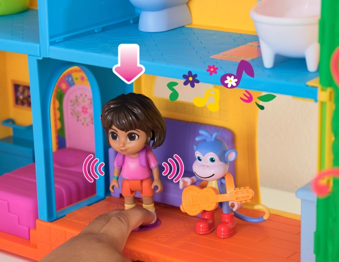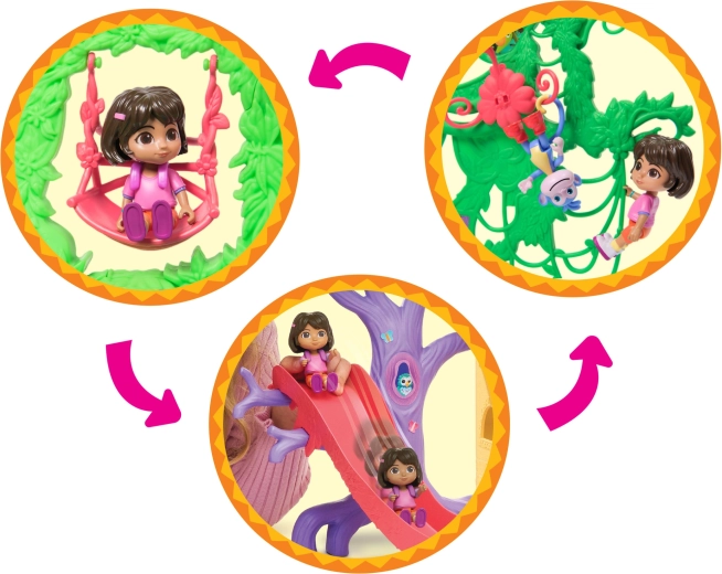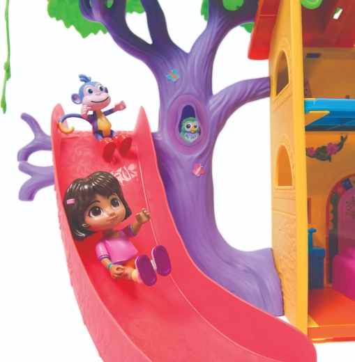 Vstopite v barvito hišico v džungli, navdihnjeno s serijo Dora raziskovalka, in se podajte na pustolovščino. Notranjost ponuja več podrobno zasnovanih sob s pohištvom (npr. kavč, kad), medtem ko zunanjost navdušuje z atrakcijami v krošnjah dreves. Z enim samim pritiskom gumba v dnevni sobi zaženete zvočne učinke in glasbo, ki spodbujajo interaktivno učenje in zabavo.