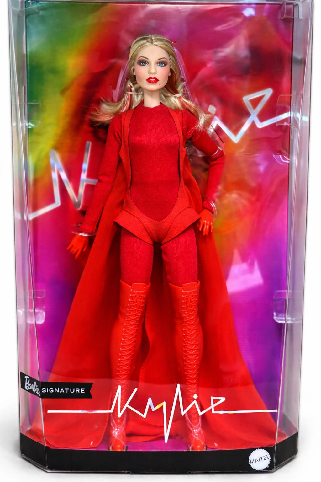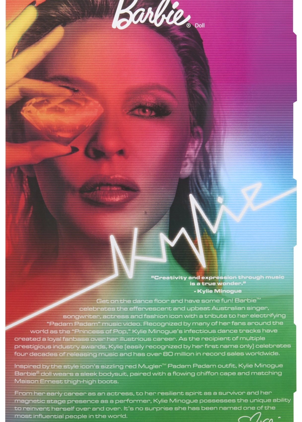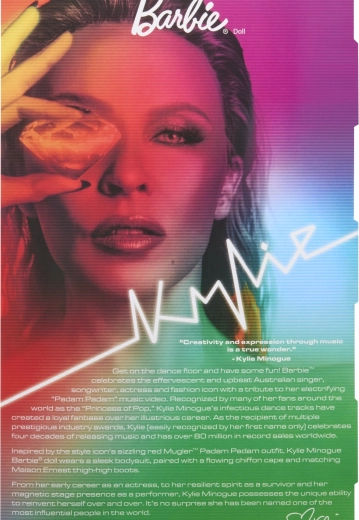 Ta zbirateljska edicija Barbie se poklanja navdihujočim ženskam v seriji Role Models. Punčka upodablja Kylie Minogue v dramatični rdeči stilizaciji, navdihnjeni z glasbenim videom, z dolgimi blond lasmi in nežnimi rdečimi prameni, modrimi očmi in natančnim make-upom za avtentičen, odrski videz.