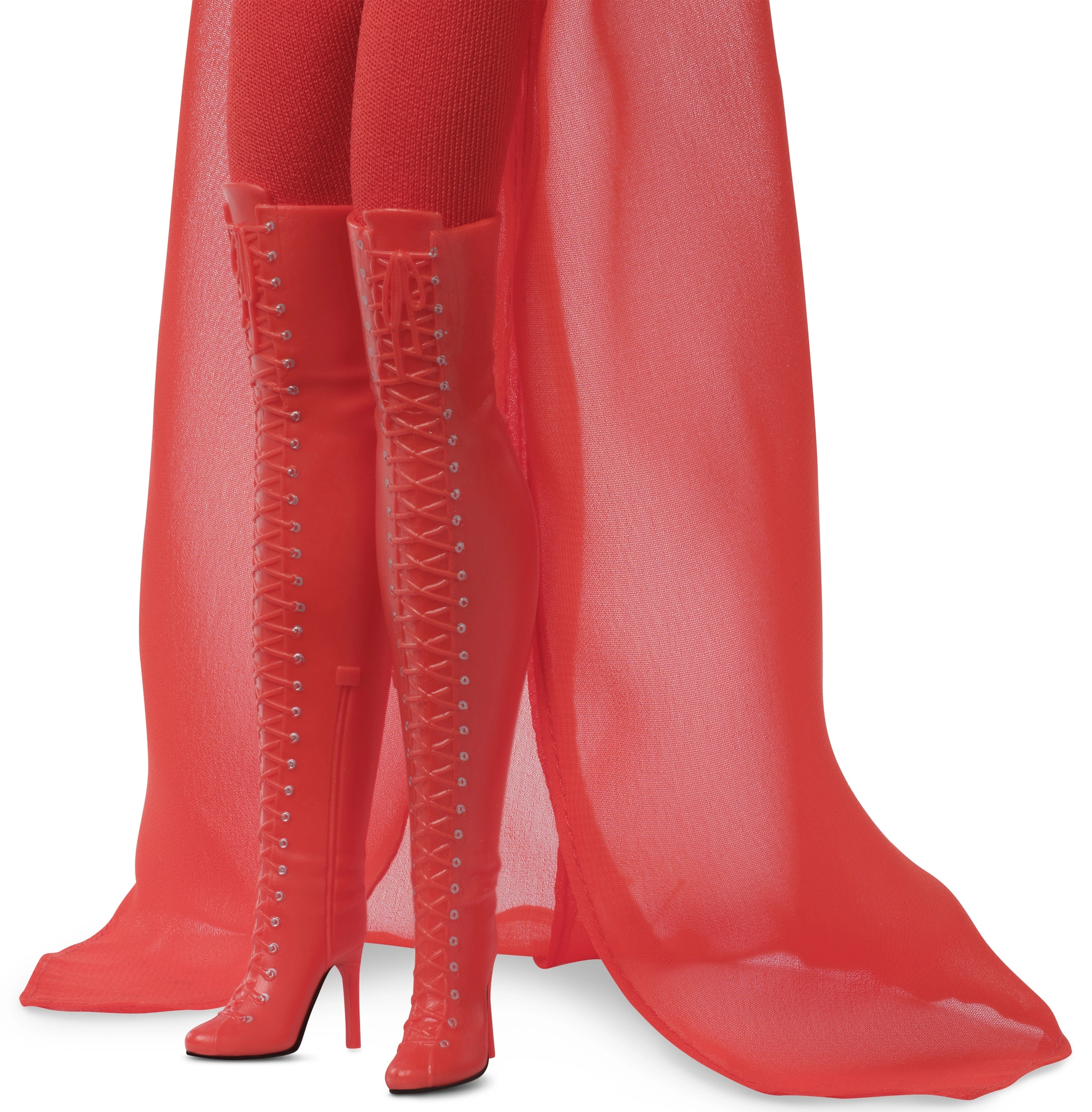Obleko sestavlja oprijet rdeč pajac s prosojnim učinkom in kratek zgornji del, ki prehaja v dolgo, tekočo pelerino. Videz dopolnjujejo škornji nad koleni z vezalkami in visokimi petami – pravi statement kos za razstavo.