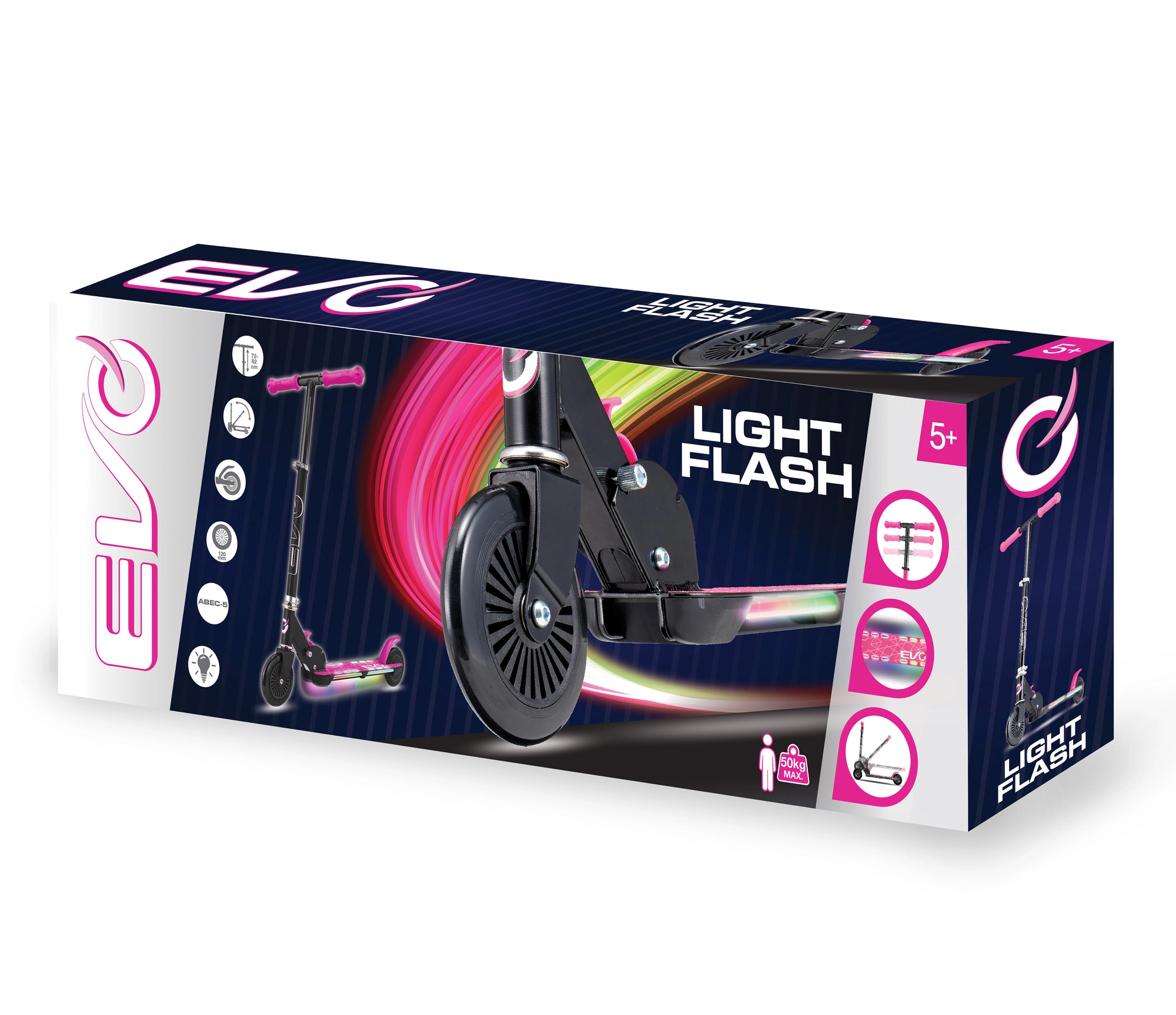 Skiro EVO Light Flash je odlična izbira za aktivne otroke. Zaradi lahkega in zložljivega okvirja se enostavno prenaša in shranjuje, nastavljiva višina krmila (pribl. 67–77 cm) raste skupaj z otrokom, LED podest pa vsako vožnjo spremeni v zabavno doživetje. Kavčukova kolesa z ležaji ABEC-5 so namenjena udobni in tihi rekreativni vožnji po ravnih površinah.