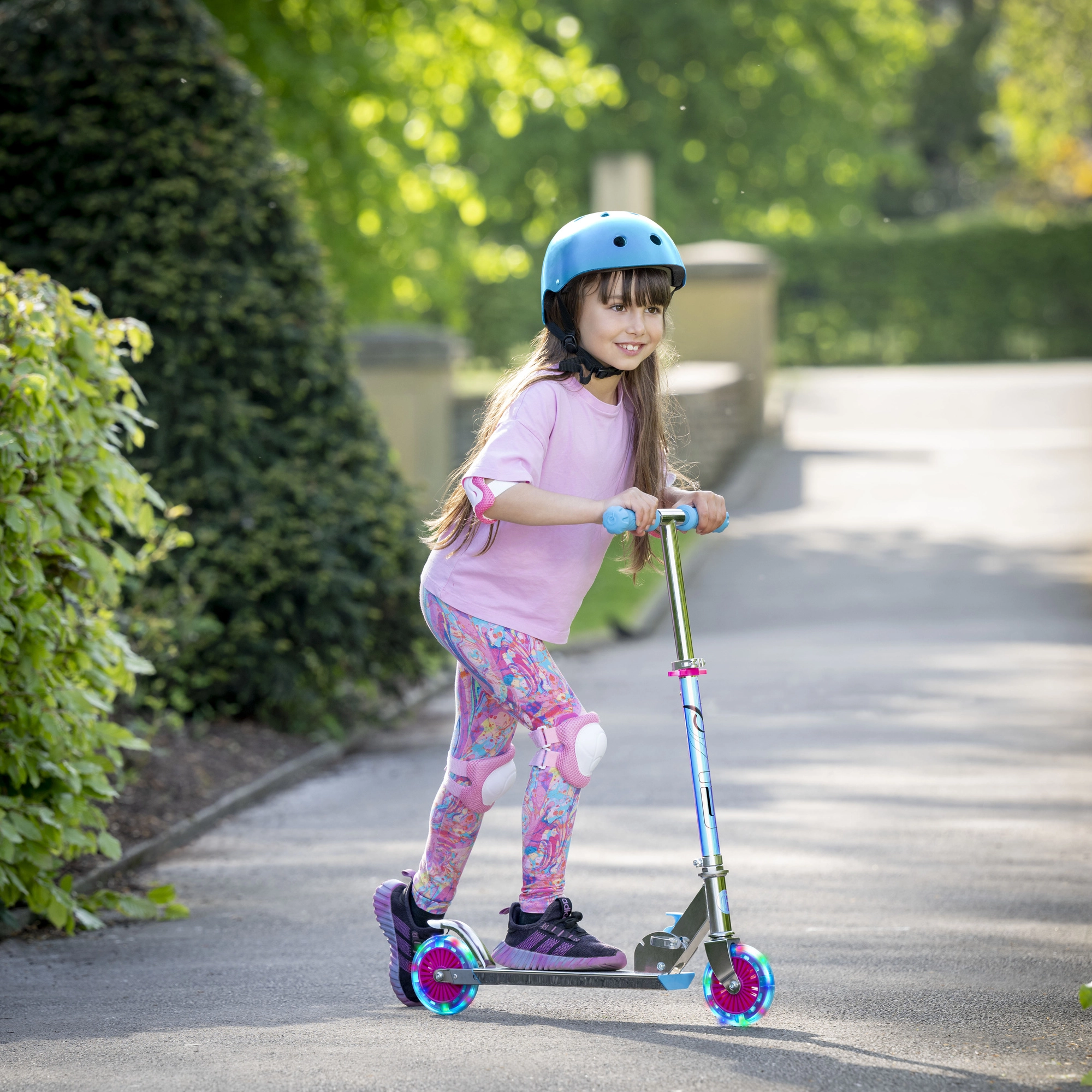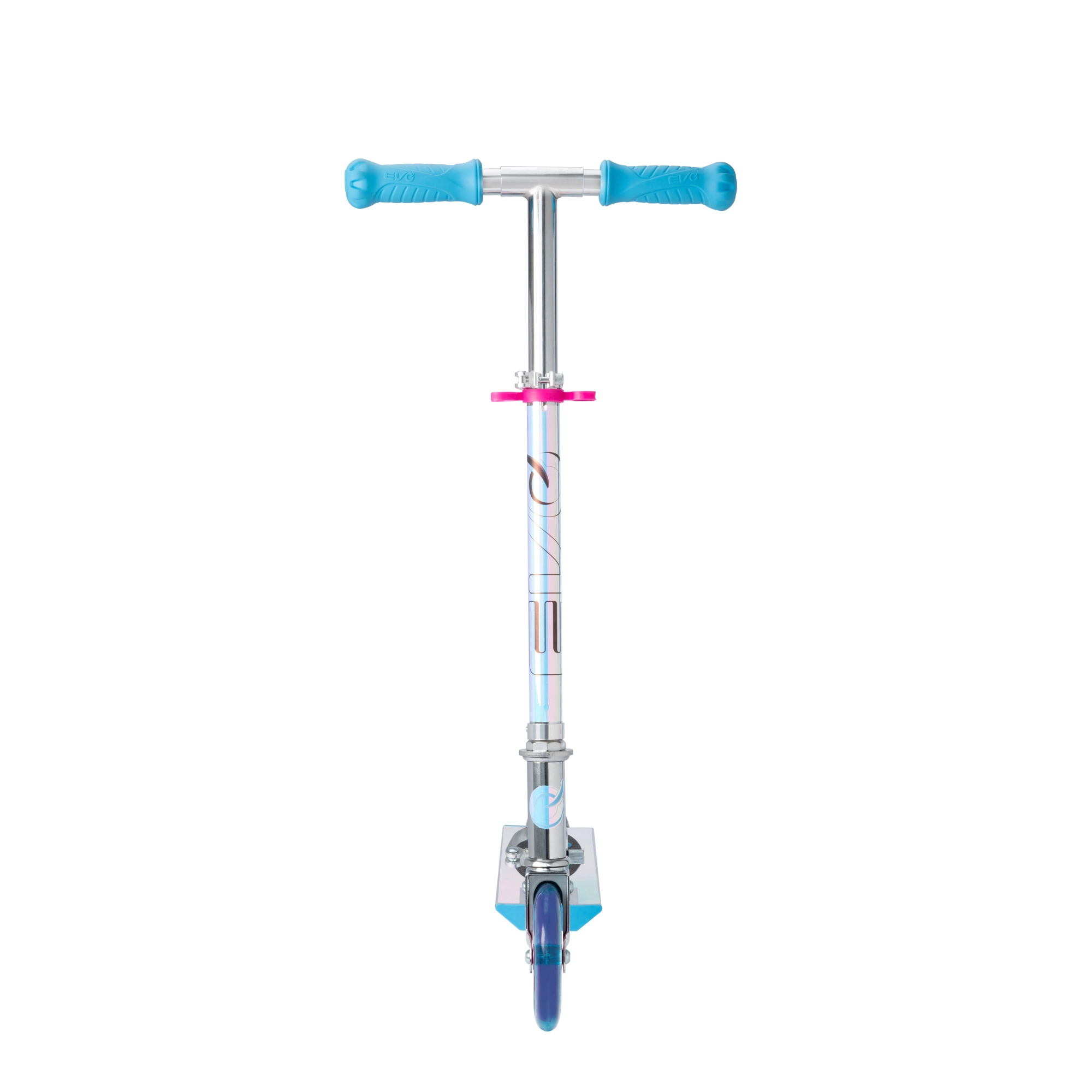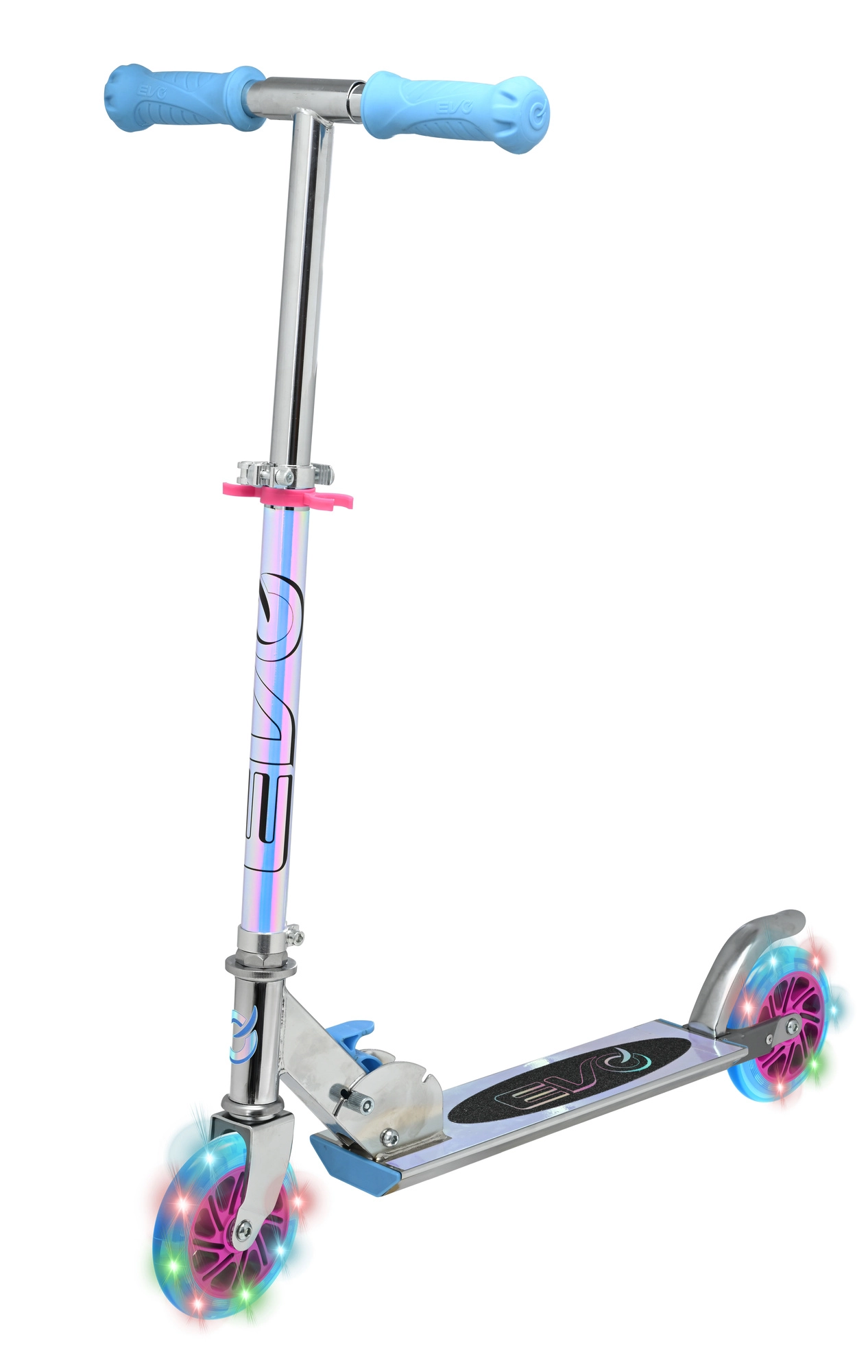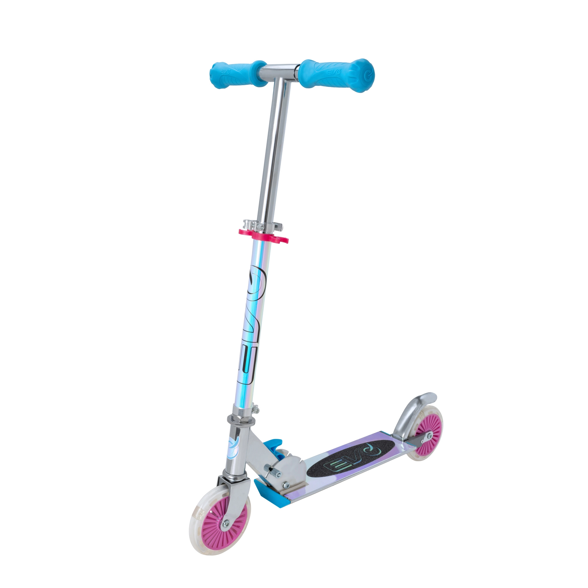Lahek in vzdržljiv otroški skiro EVO z LED svetlečimi kolesi, zložljivim okvirjem in nastavljivo krmilno palico za otroke od 5 let. Ponuja gladko vožnjo zahvaljujoč ležajem ABEC-5, zadnjo nožno zavoro za varno ustavljanje in največjo nosilnost 50 kg. Odlična izbira za zabavo v parku in na pločniku.