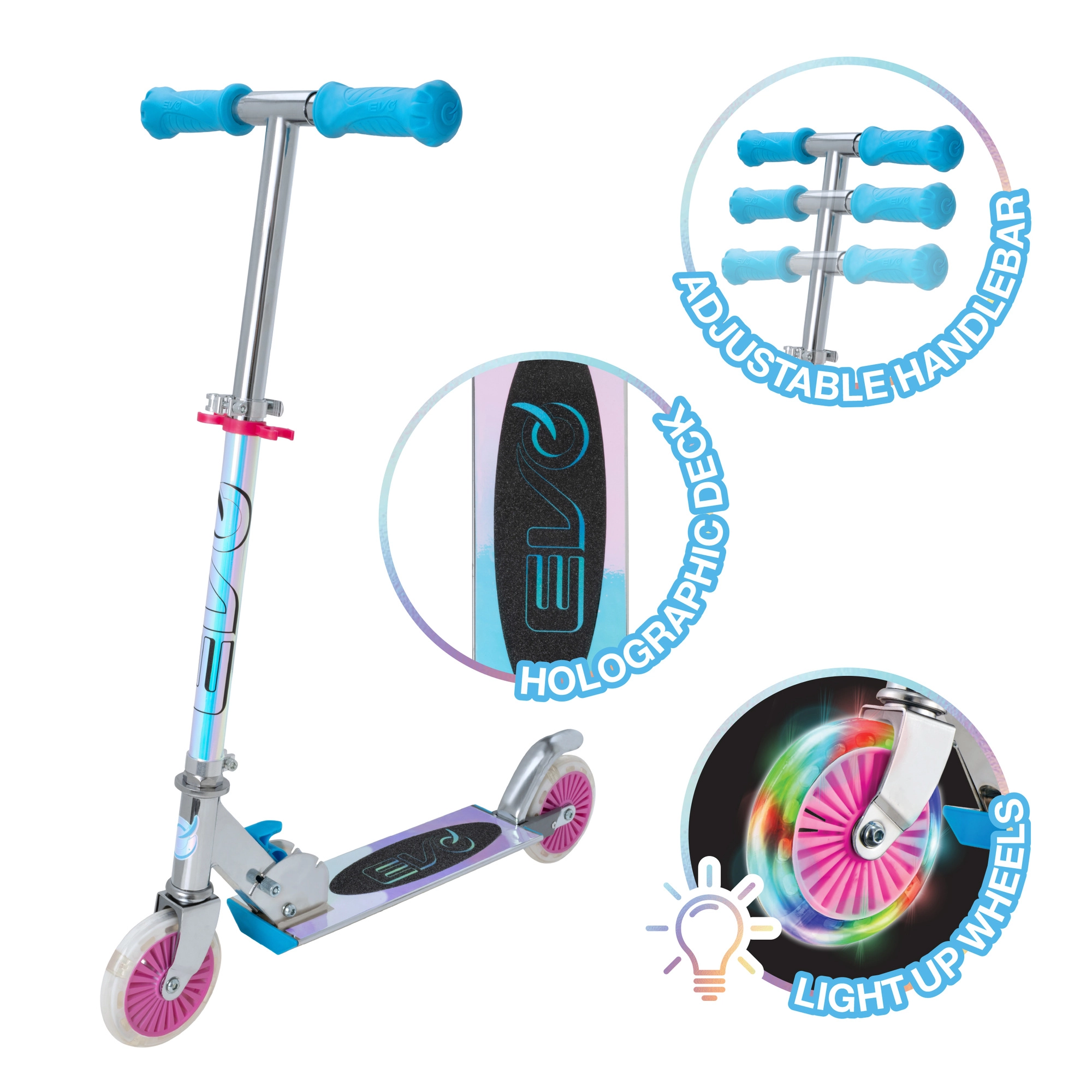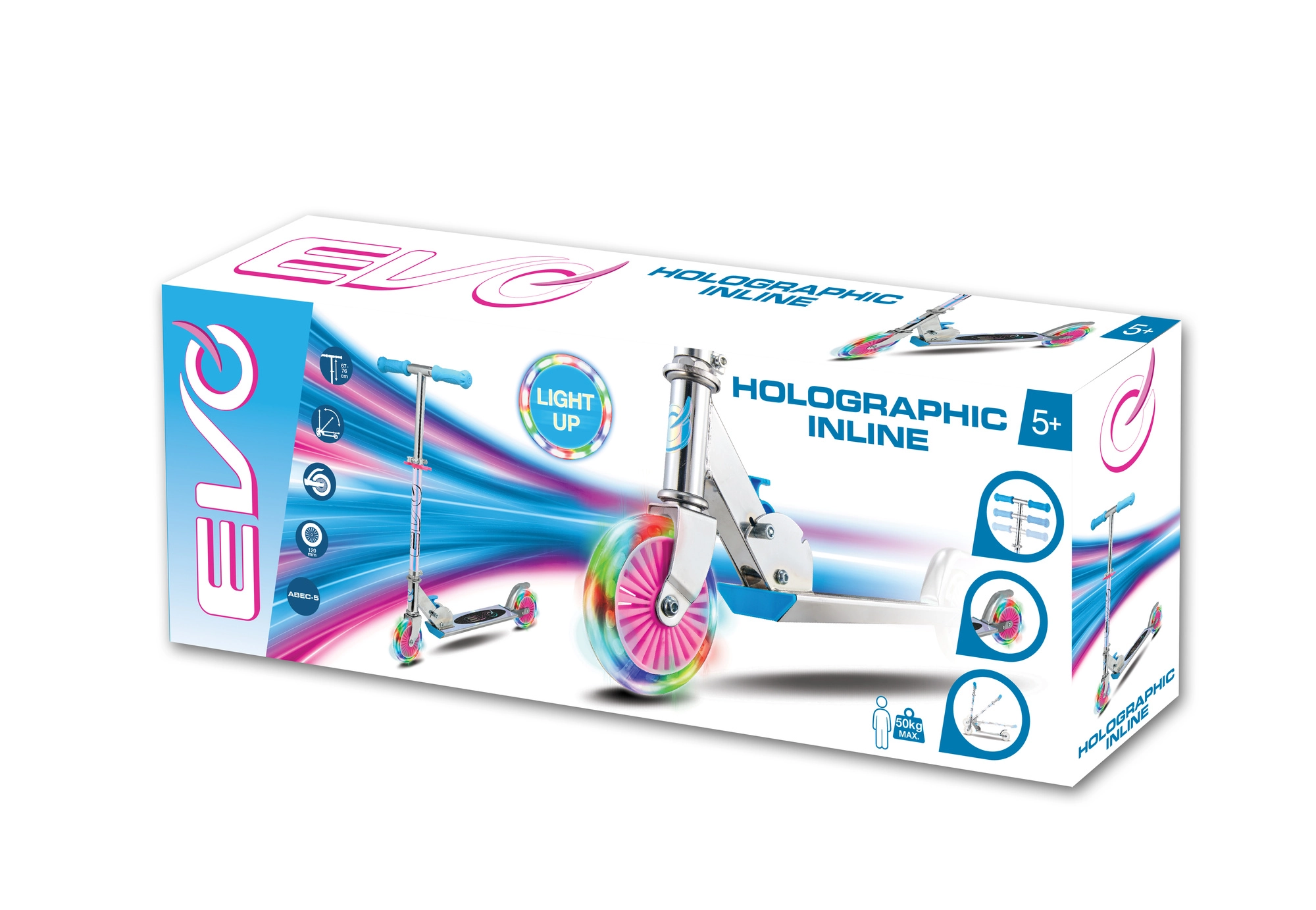 Skiro EVO Holographic Inline združuje zabavo in varnost. Zahvaljujoč svetlečim LED kolesom je vsaka vožnja privlačna, medtem ko nastavljiva višina krmila (pribl. 67–77 cm) omogoča udobno prilagoditev rasti otroka. Zložljiva konstrukcija olajša prenašanje in shranjevanje doma ali v prtljažniku avtomobila.