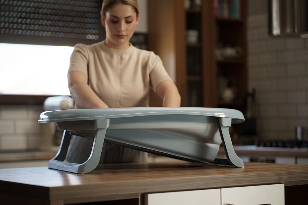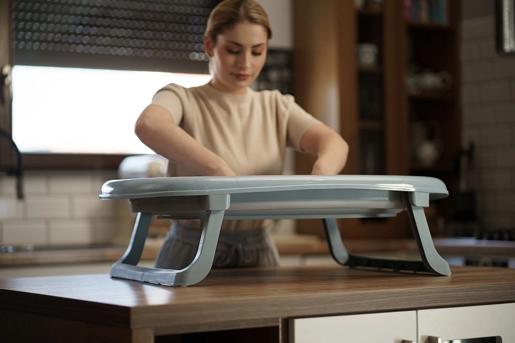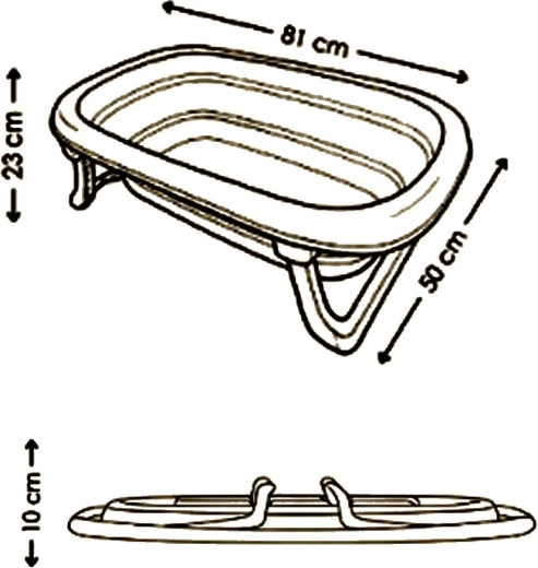 Zaradi trdnih plastičnih nogic, ki se preklopijo neposredno pod kad, je izdelek stabilen pri uporabi in hkrati izjemno kompakten pri shranjevanju – po zlaganju ima višino le 10 cm. Materialna sestava združuje odporen polipropilen v spodnjem delu in elastomer v zložljivem delu za dolgo življenjsko dobo in udobje.