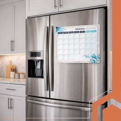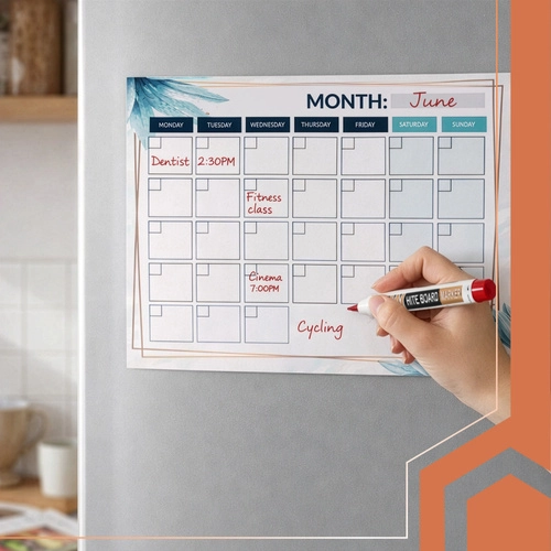 Suho brisljiva površina omogoča večkratno pisanje in brisanje brez nereda. Močna magnetna zadnja stran zagotavlja stabilno pritrditev na hladilnik ali drugo kovinsko površino. Praktičen odsek za zapiske ohranja pomembne informacije vedno pri roki, barvni označevalci pa poudarijo prioritete.