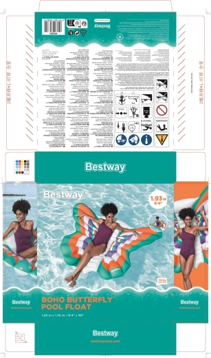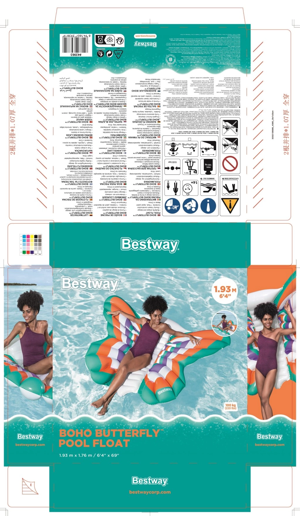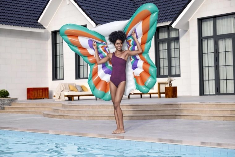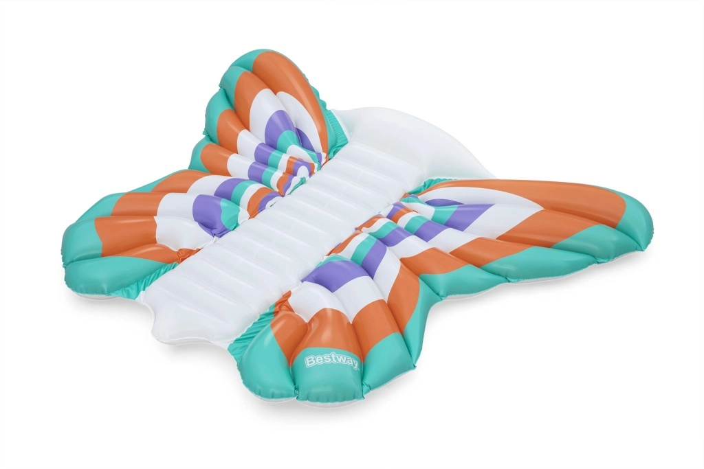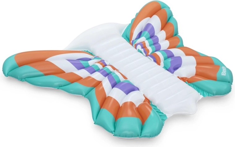 Uživajte poletje na vodi z napihljivo blazino v obliki metulja v dimenzijah 193 × 176 cm. Ponuja prostorno in udobno ležanje, stabilnost na vodni gladini in vzdržljiv material s tehnologijo Color Shield™, ki ohranja barve žive ter se ne prenaša na mokro kožo. Zahvaljujoč največji nosilnosti 100 kg in hitremu ventilu za napihovanje je idealna za bazen, jezero in morje.