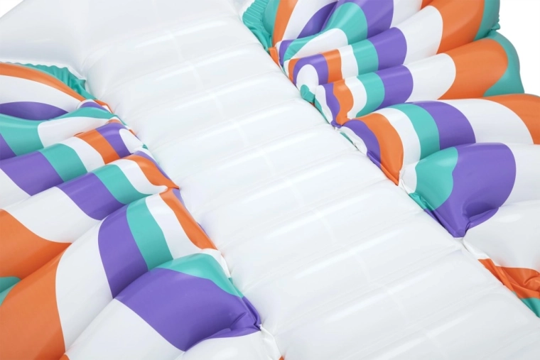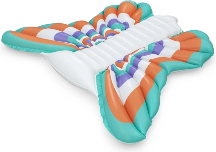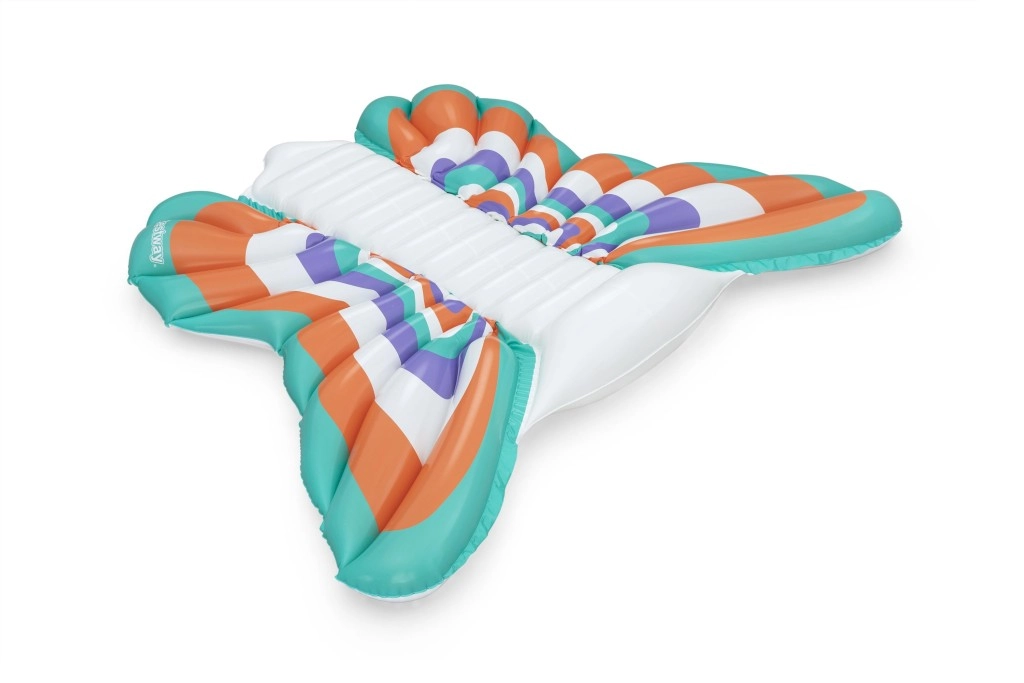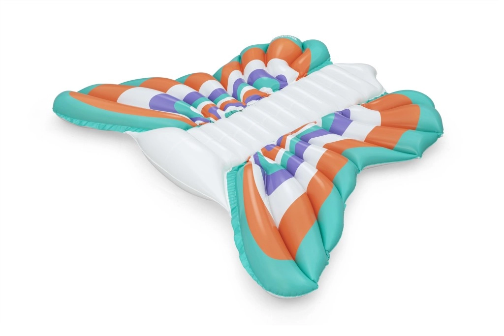 Ta stilska napihljiva blazina v dizajnu metuljevih kril prinaša odlično kombinacijo udobja in zabave. Barvni paneli v odtenkih oranžne, turkizne, vijolične in bele ustvarjajo privlačen videz, medtem ko rebrasti sredinski pas nudi udobno oporo hrbtu in sproščeno držo na vodi.