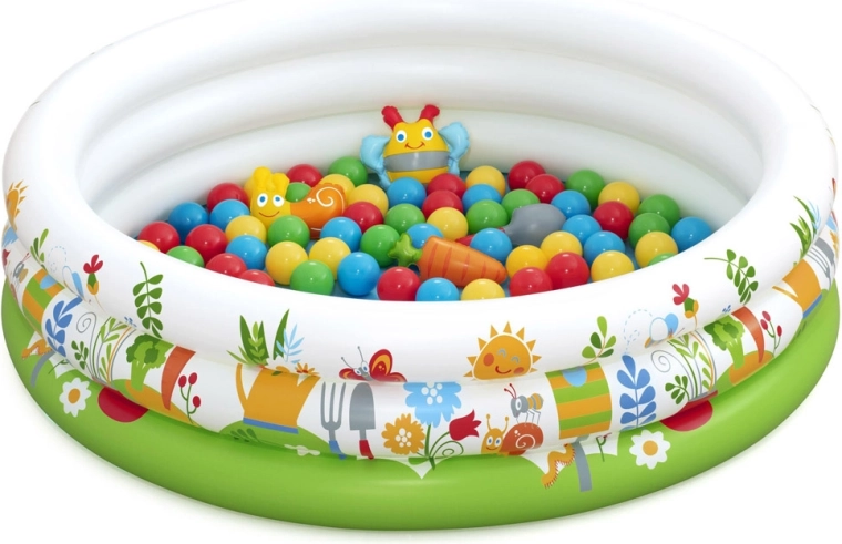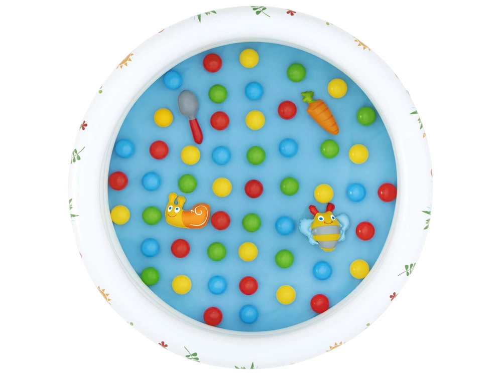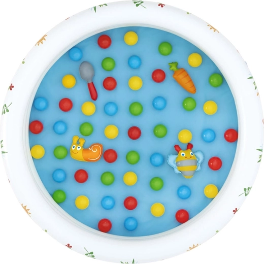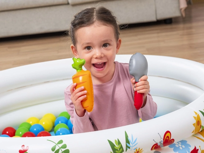 Del kompleta je 46 barvitih žogic in 4 odpirajoče žogice–presenečenje z ljubkimi igračkami (npr. polž, čebelica, korenček, zajemalka), ki spodbujajo radovednost in kreativnost. Enostavna postavitev, preprosto vzdrževanje in priložen obliž za popravilo zagotavljajo brezskrbno uporabo.