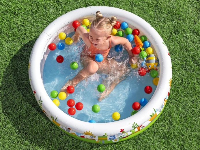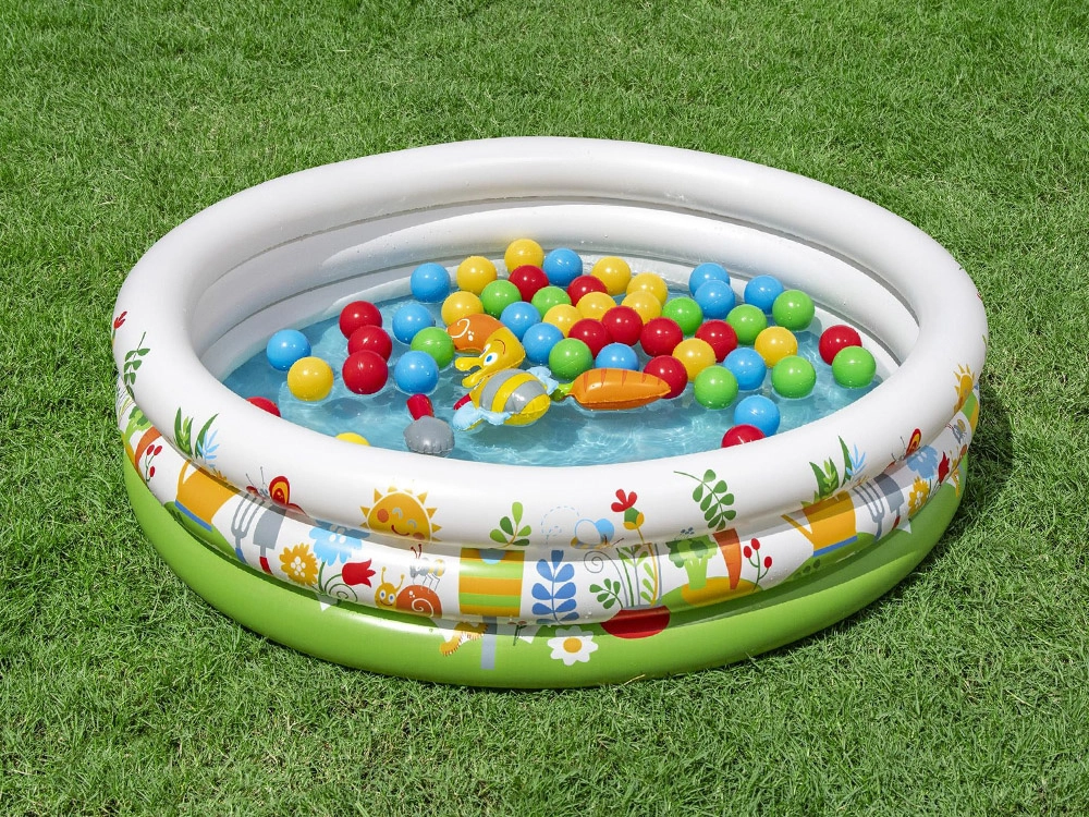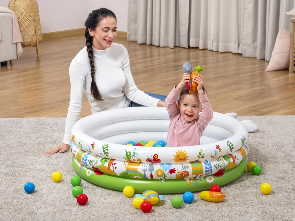 Uživajte v igri vse leto – doma z žogicami ali na prostem z vodo. Plitev volumen je idealen za prve vodne radosti in varno osvežitev.