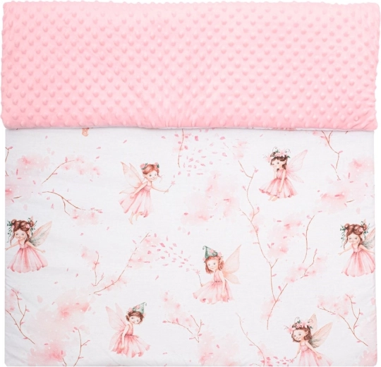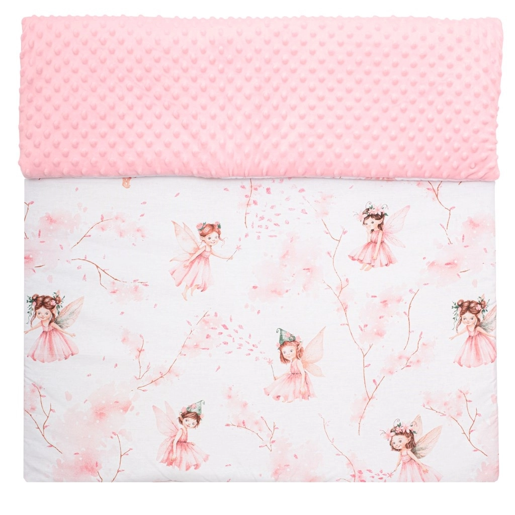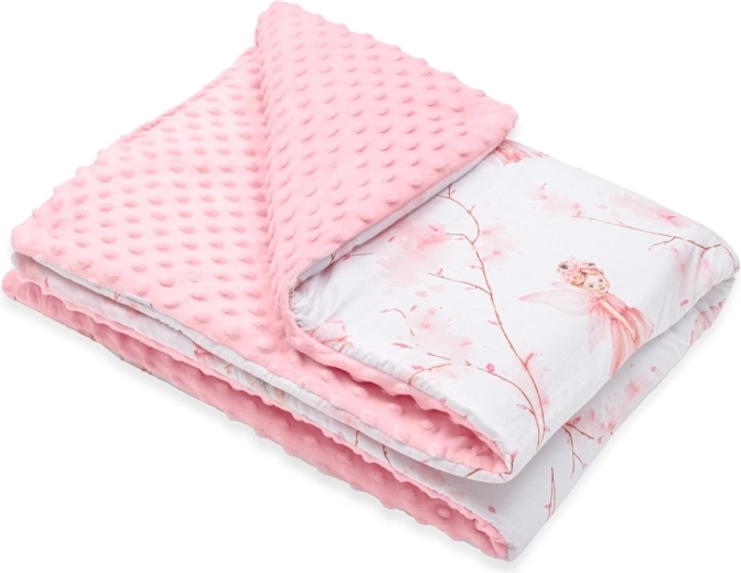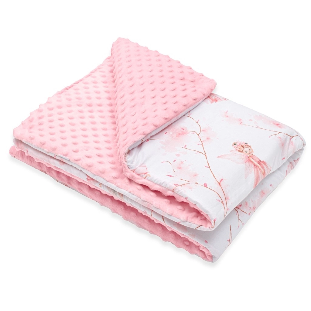 Mehka otroška odeja New Baby z motivom vil združuje nežno minky blago s 3D pikicami za senzorično spodbudo in zračno 100% bombaž z nežnim tiskom. Zahvaljujoč antialergijskemu polnilu je odeja prijetno topla, idealna za voziček, posteljico in avtosedež. Ne spušča barve, je nežna do občutljive kože in brez gumbov ali trdih delov za največjo varnost.