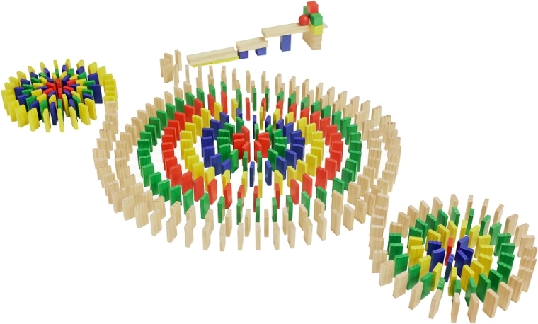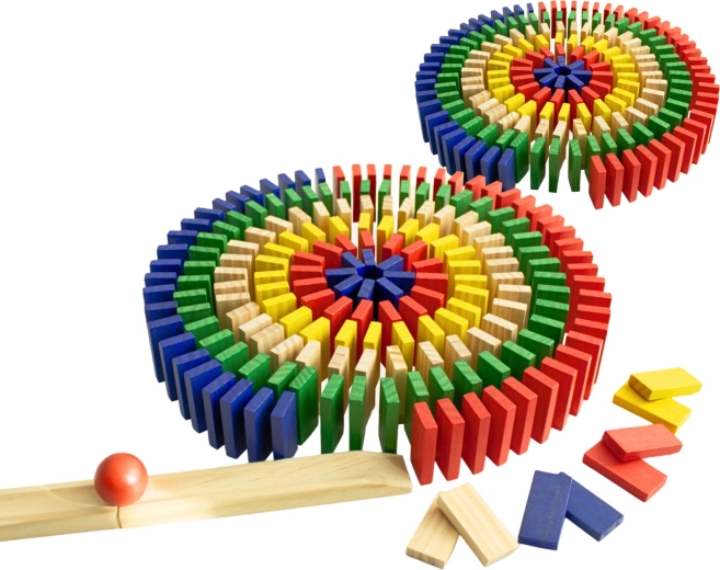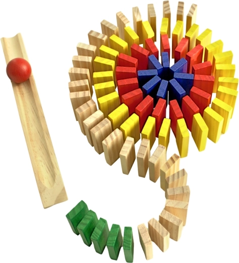 V kompletu sta lesena rampa in kroglica za učinkovit začetek domina. Opazujte tekoče in stabilno podiranje.